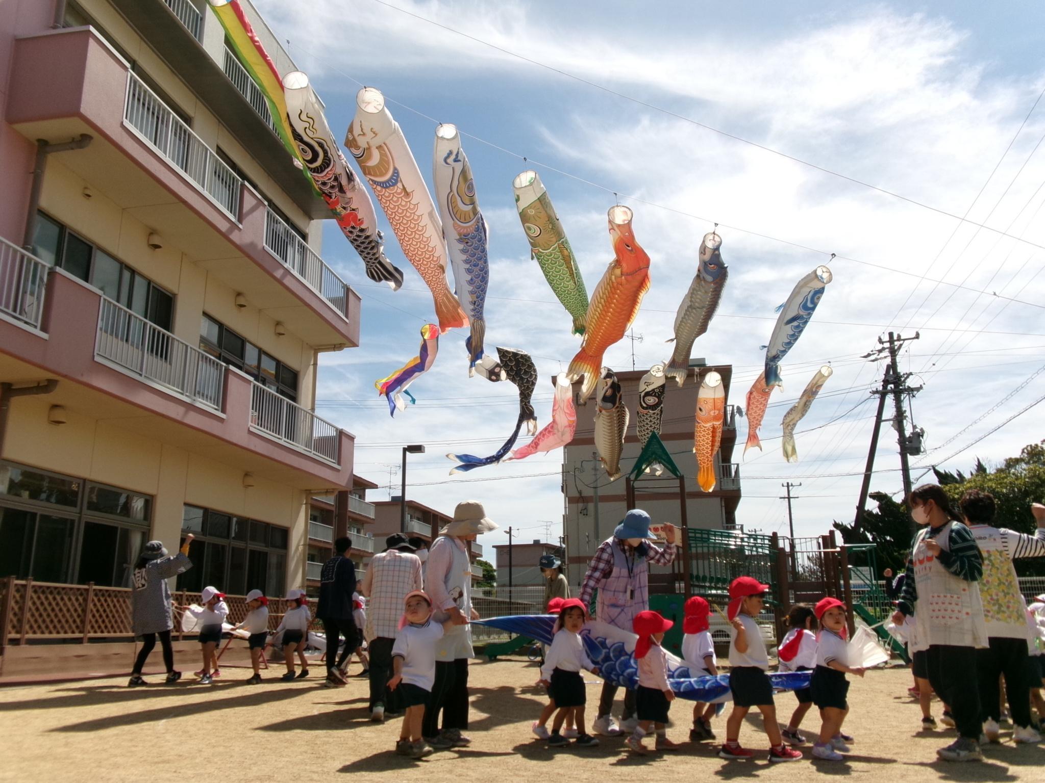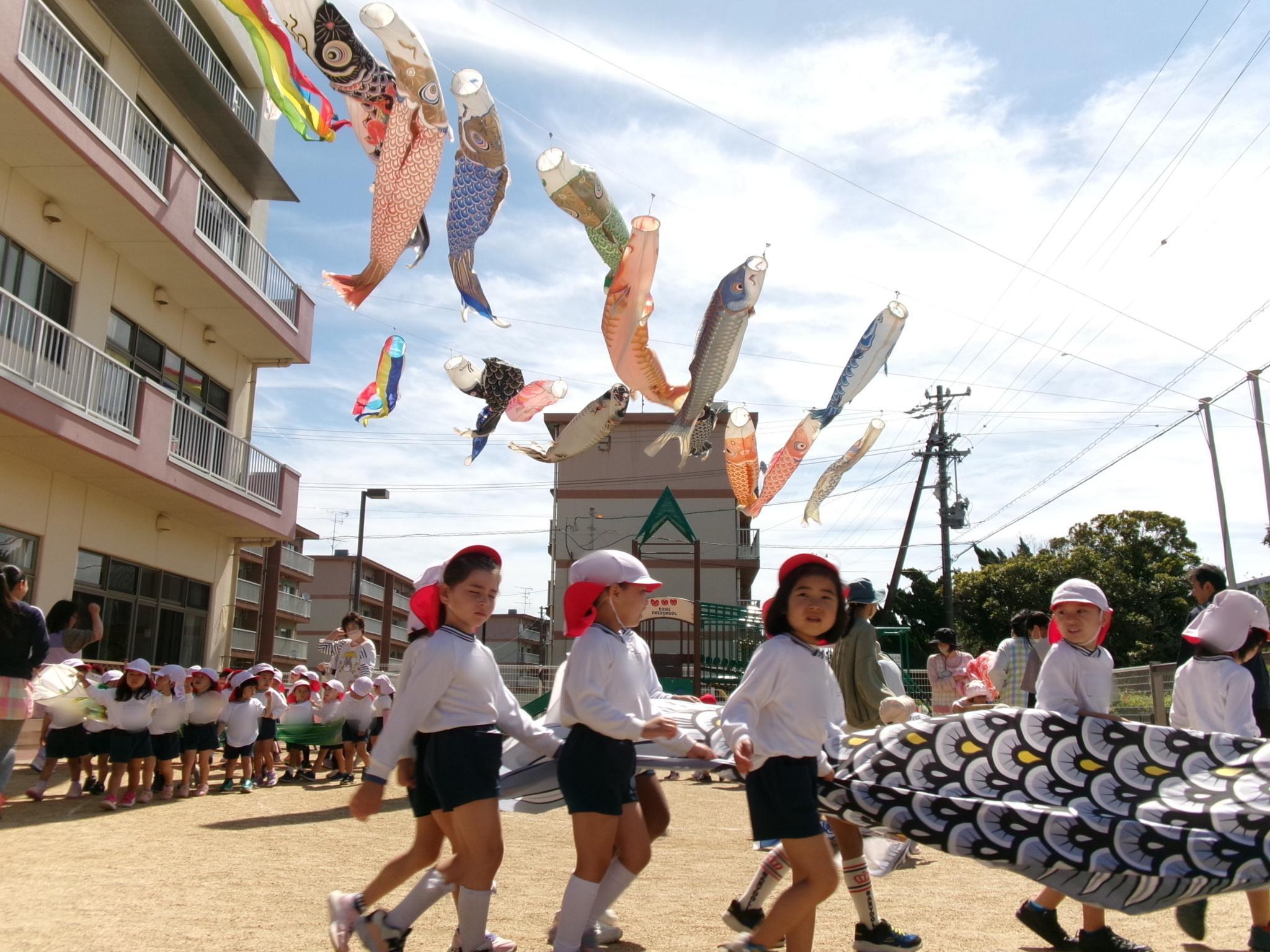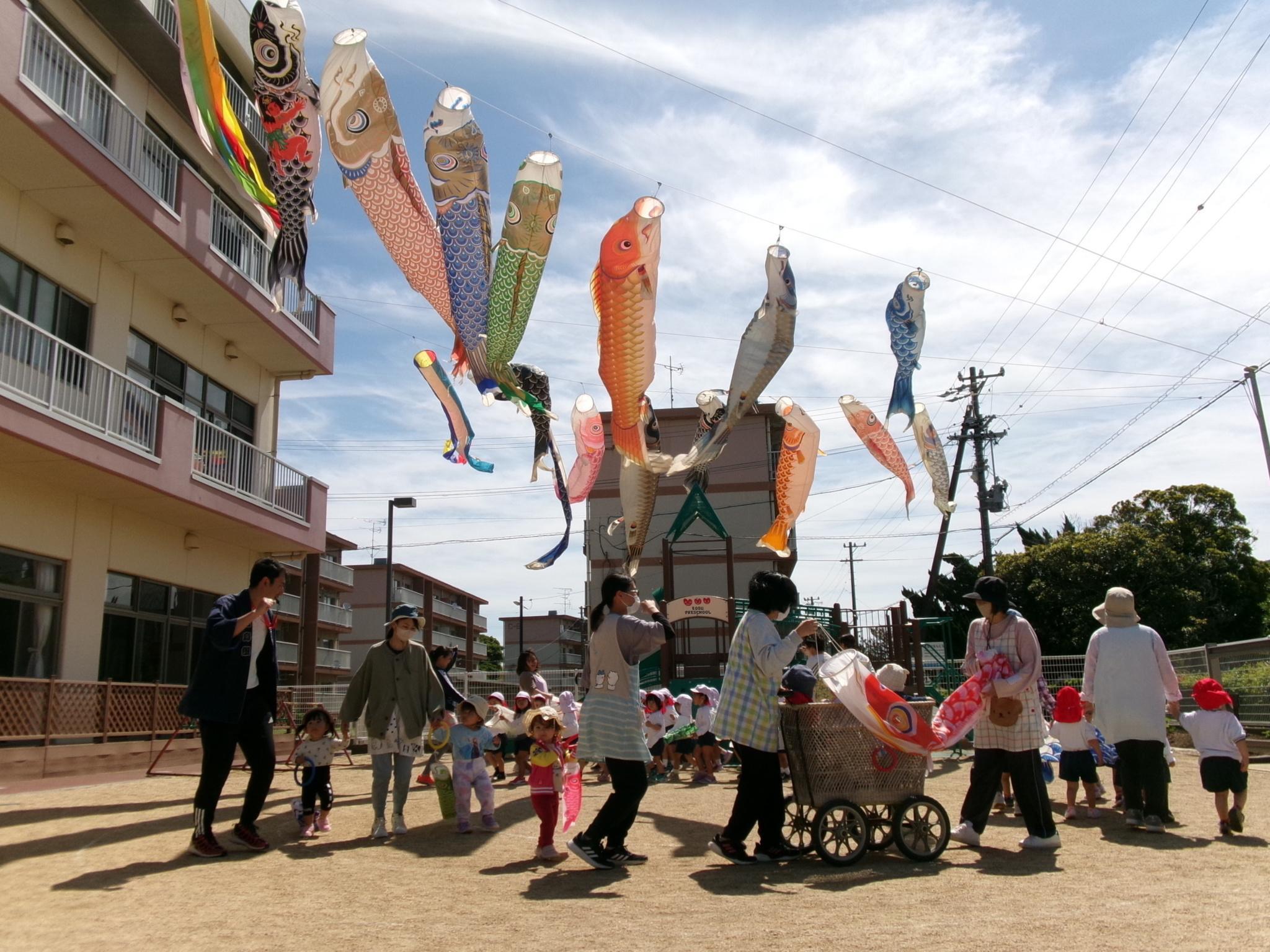 こいのぼりをたくさんあげ、手にも持ち・・・「わっしょい! わっしょい!」と元気な掛け声と共に園庭を練り歩きました!