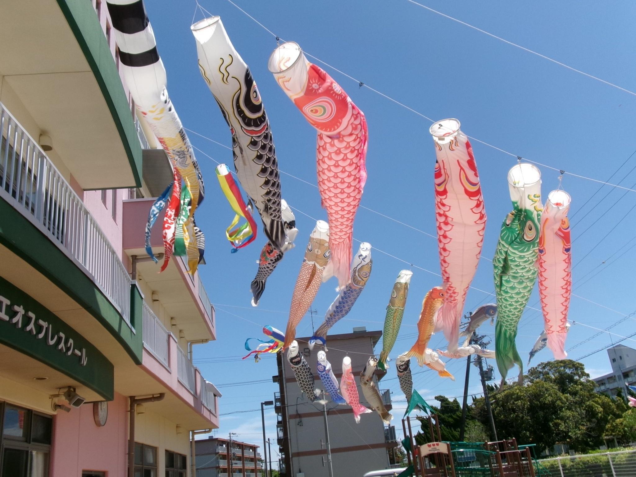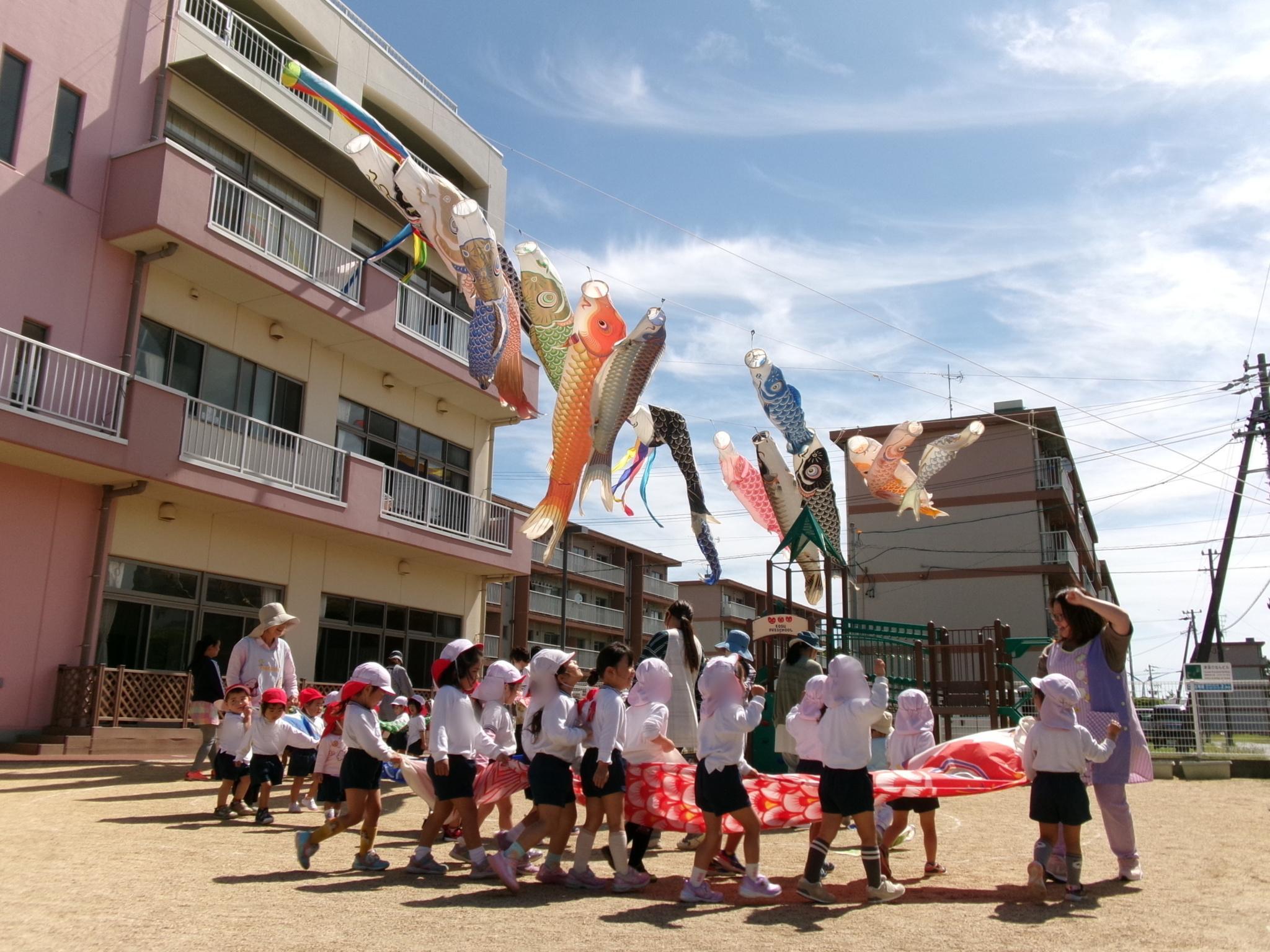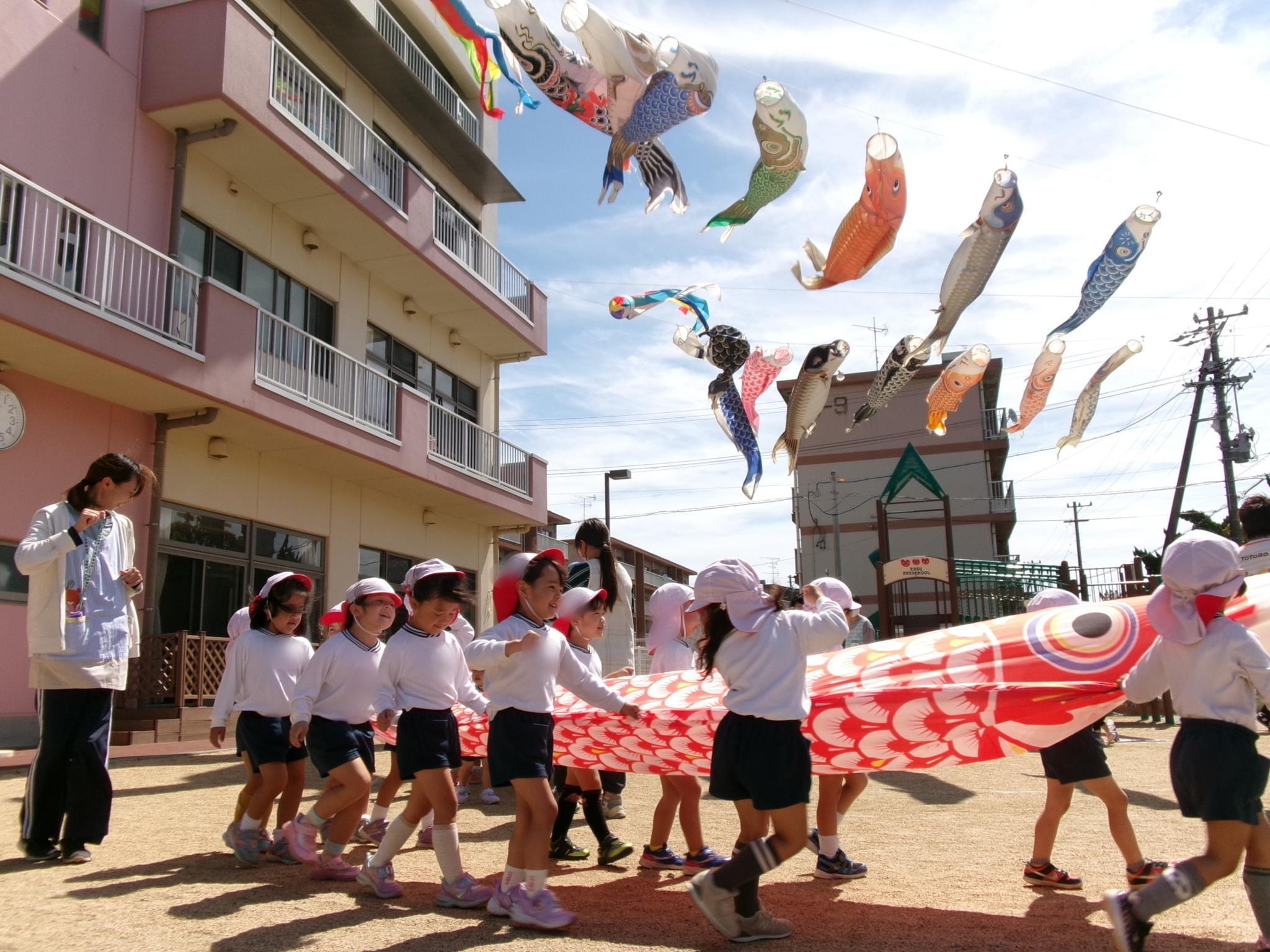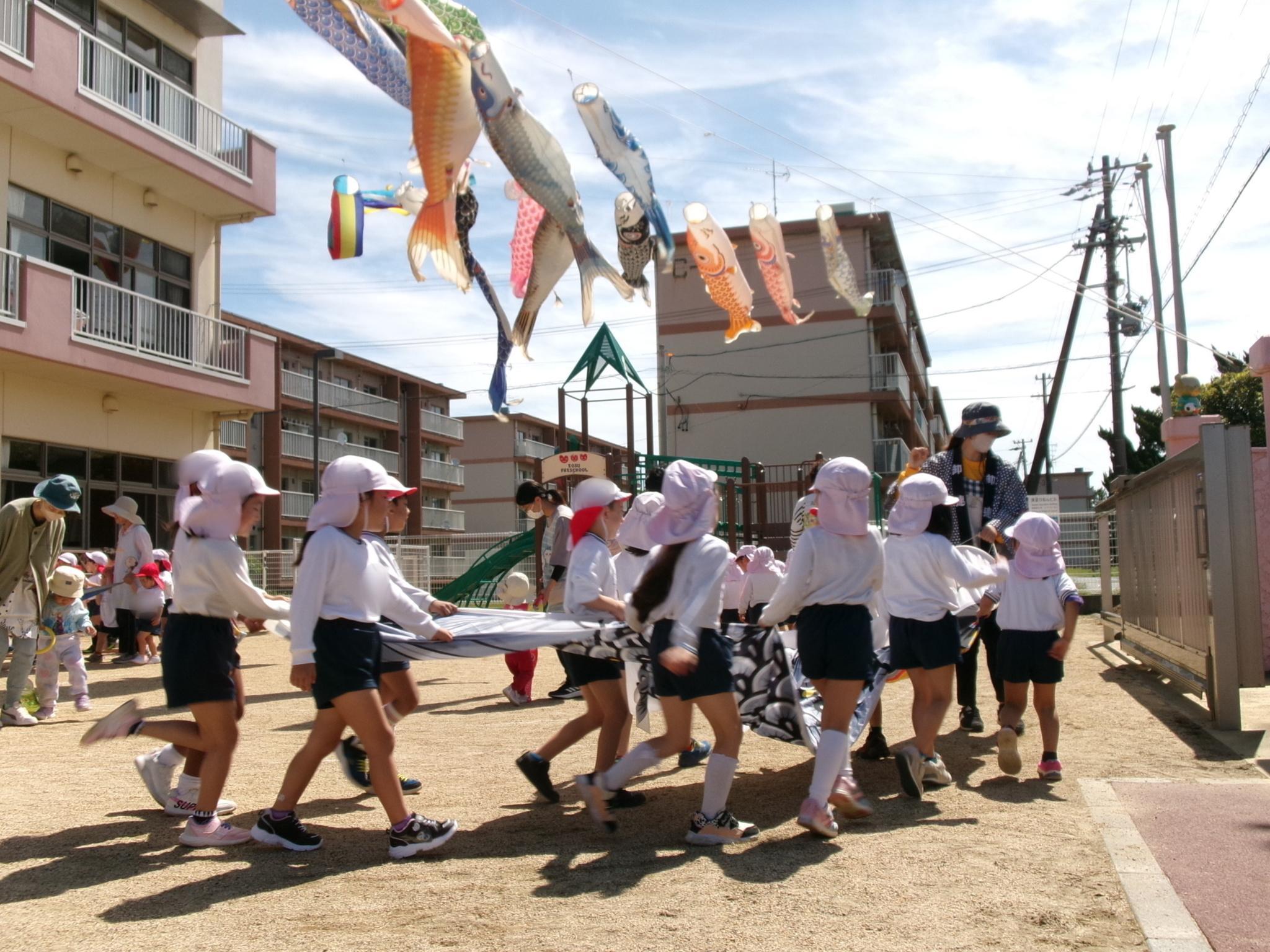 こいのぼりをたくさんあげ、手にも持ち・・・「わっしょい! わっしょい!」と元気な掛け声と共に園庭を練り歩きました!