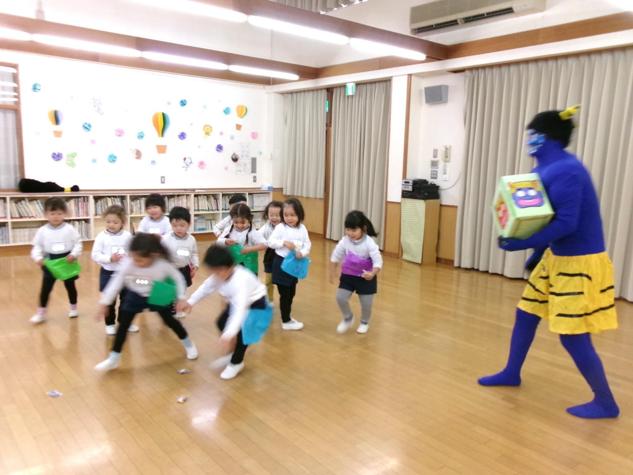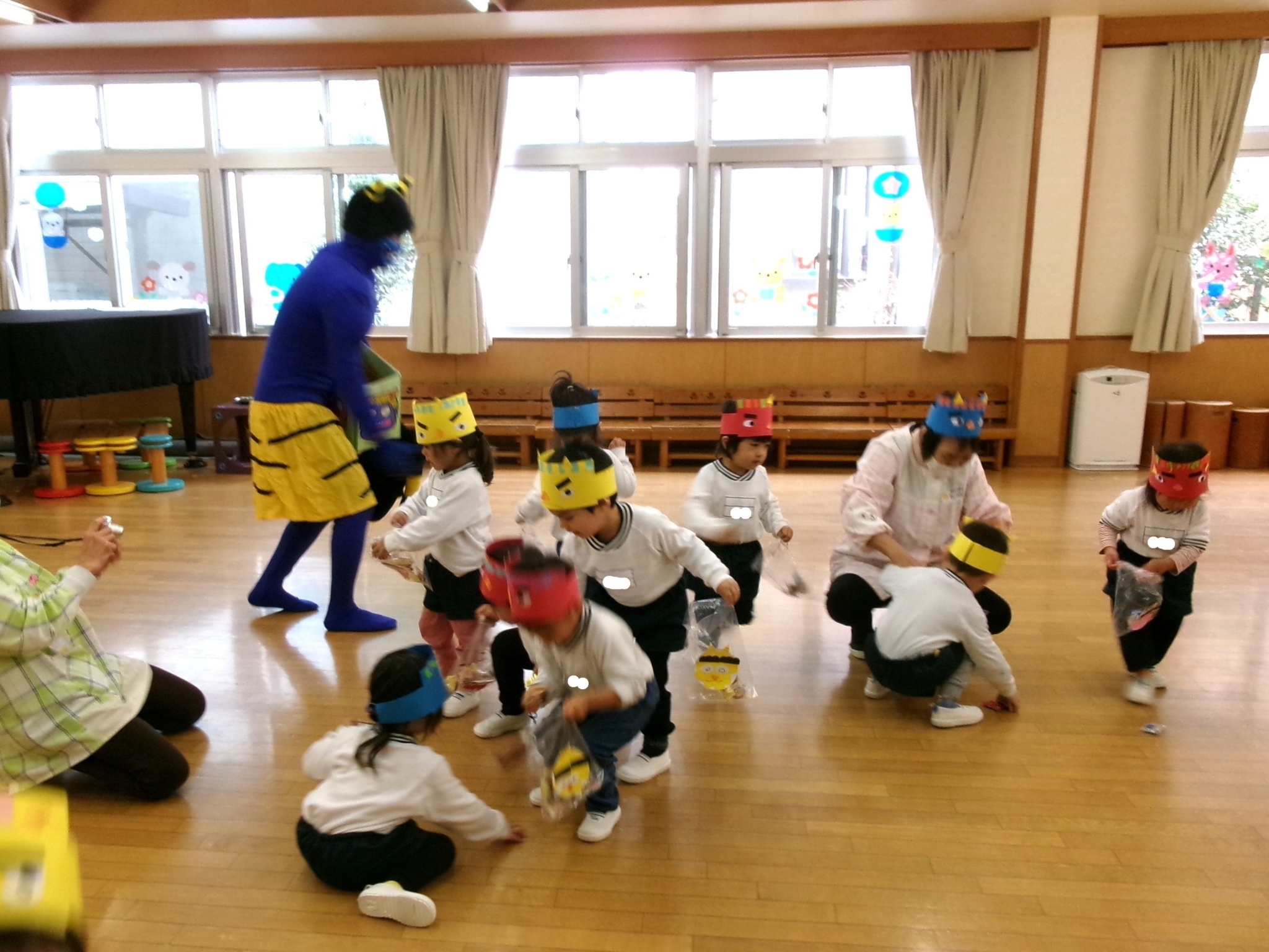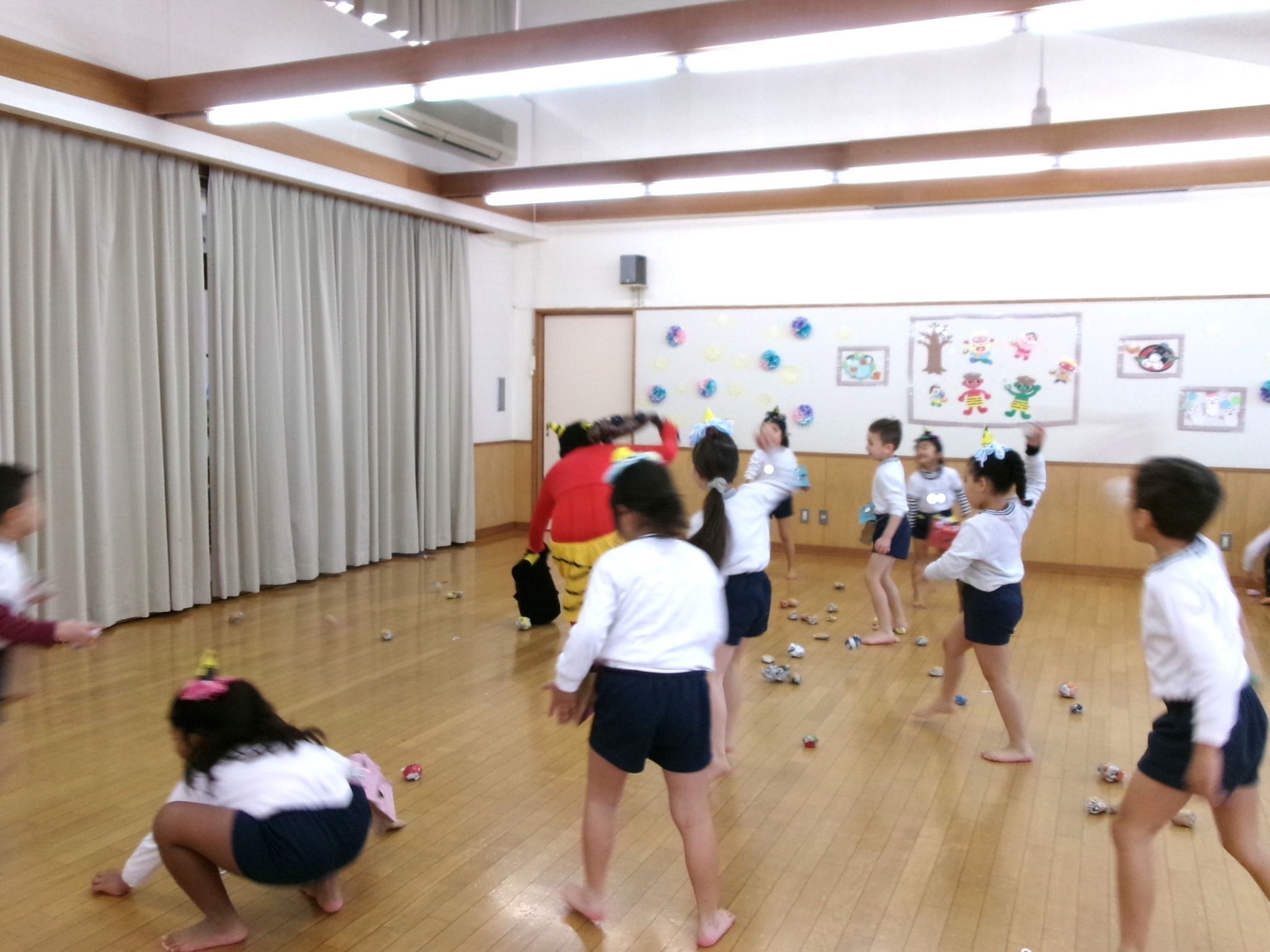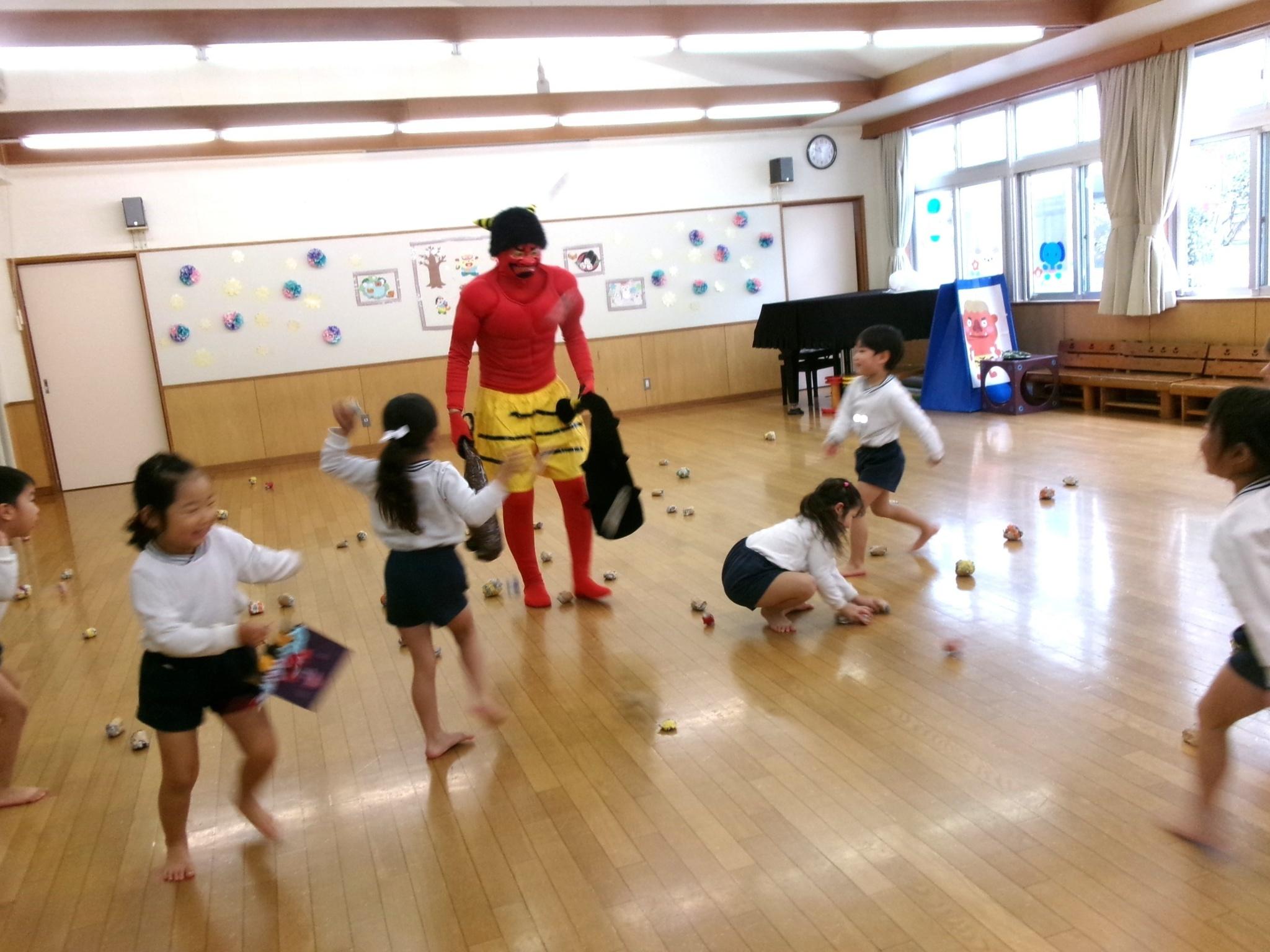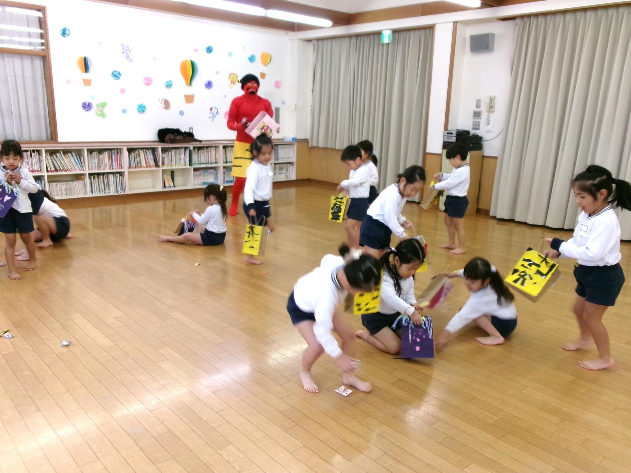 その後は、園長先生鬼にお菓子をまいてもらい、楽しみながらも真剣に拾って自分たちで作った鬼バッグに入れていました👹