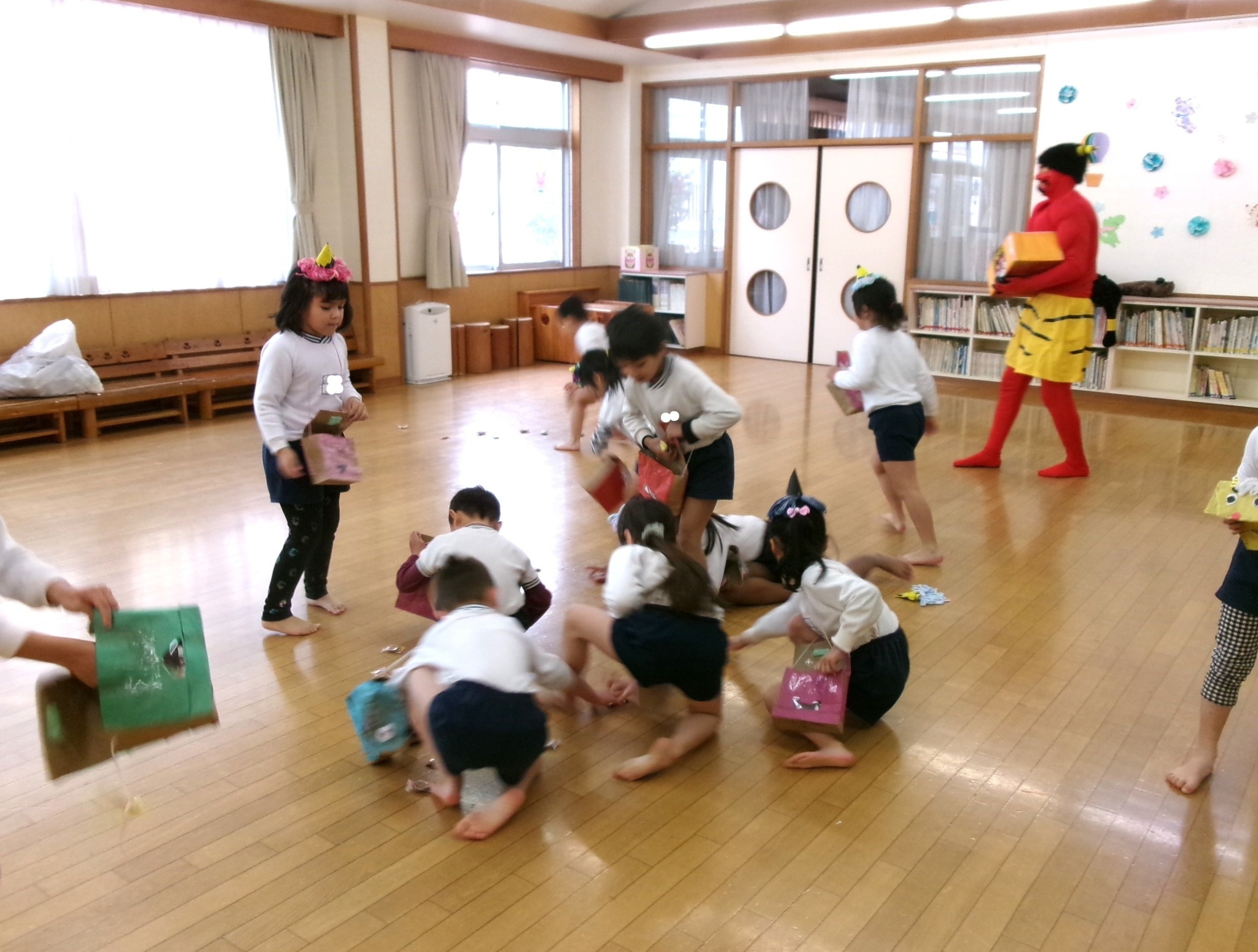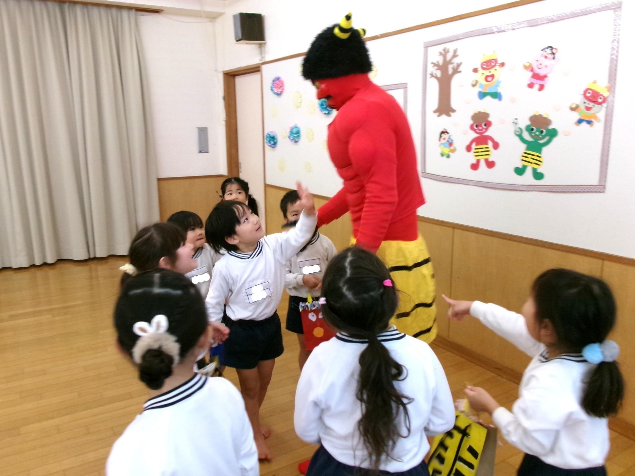 怖くて先生の後ろに隠れたり、ちょぴり涙が出てしまう子もいましたが、最後は鬼とも仲良くなり、大事に大事にお菓子を持って帰りました。