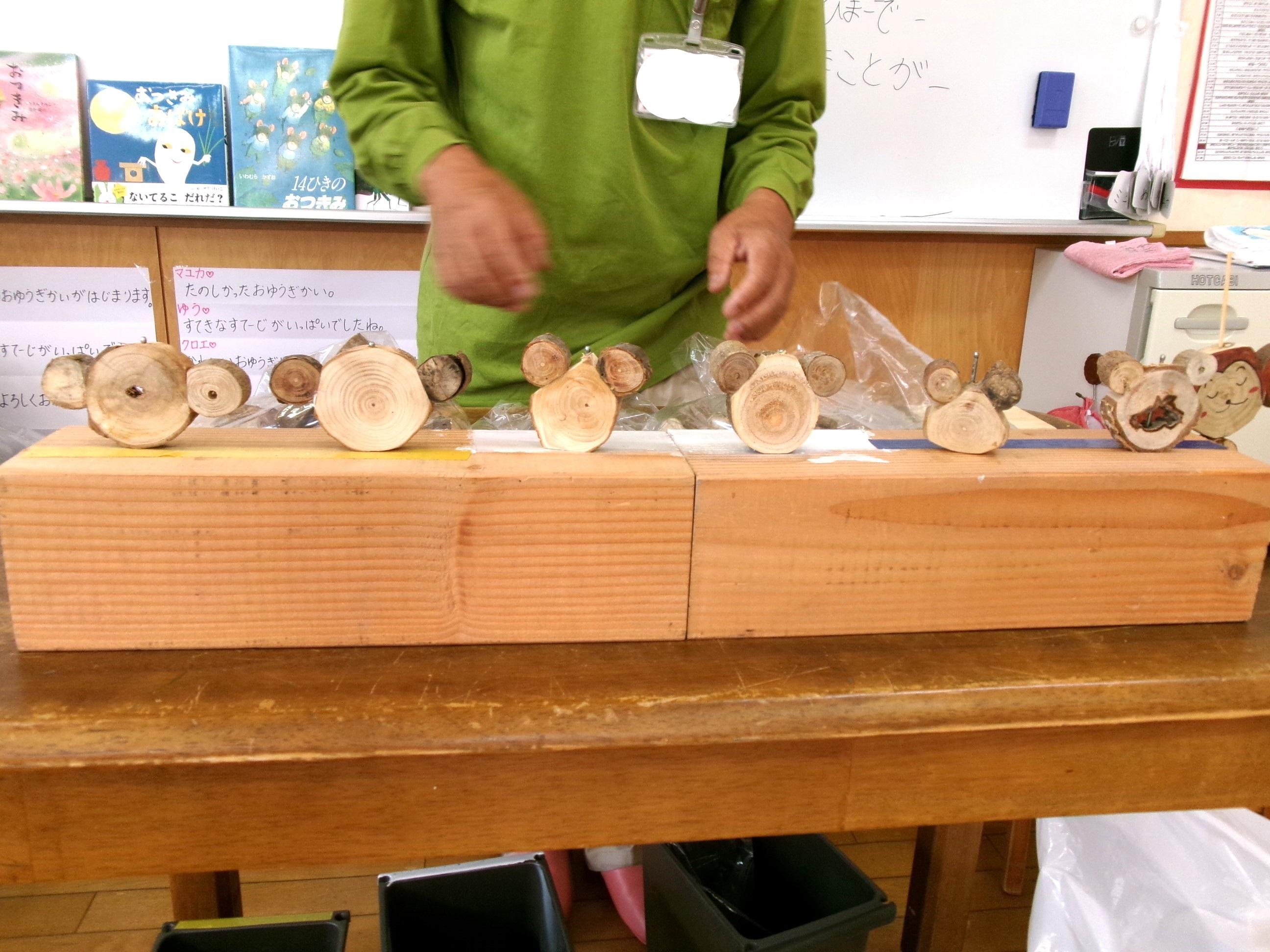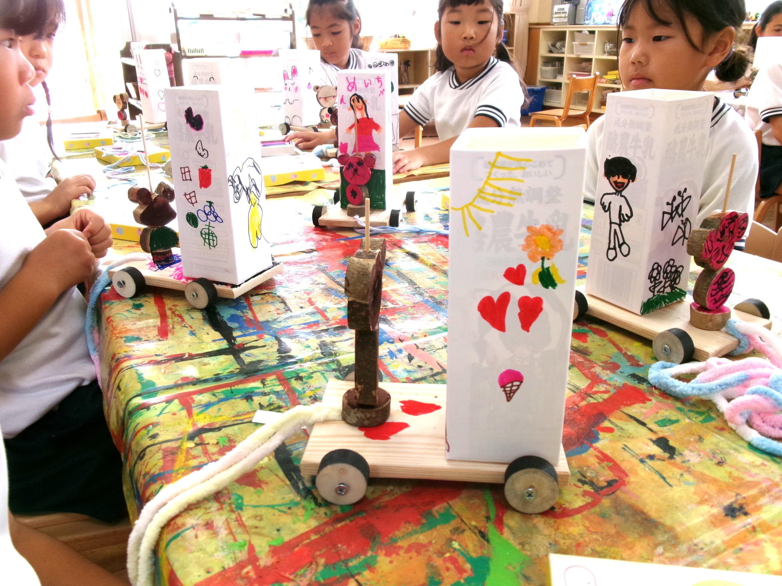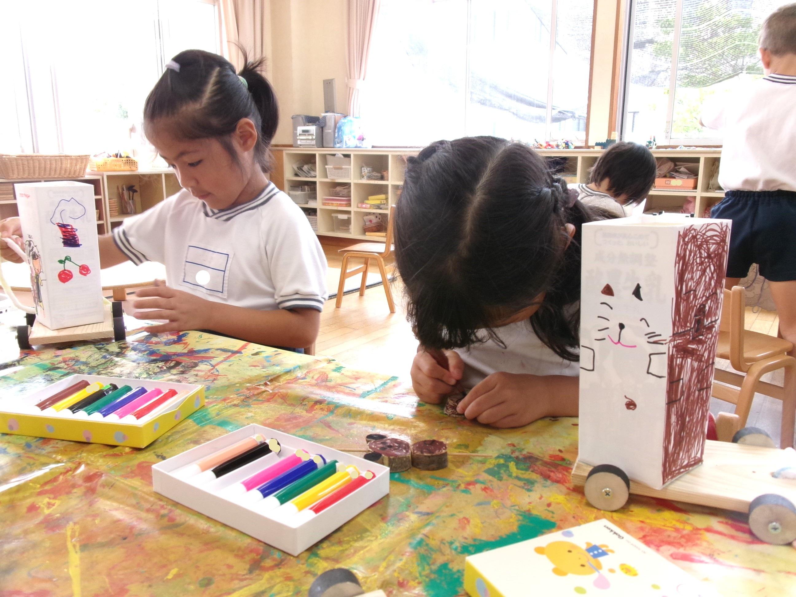 10月3日(金)に環境学習指導員の『やすおじさん』が来てくれ、ひまわり組がネイチャークラフトを楽しみました。やすおじさんが木の車やそれにつける木で作った飾りを用意してきてくれました。子どもたちがそれぞれ、書きたいもの、飾りたいものを自分で選びじっくりと時間をかけて完成させた木の車はとっても素敵でした✨お友だち同士で見せ合いっこをして、「これ良いね!」など、お互いに声を掛けていました。完成した車は遊戯室でみんなで走らせてとても楽しい時間になりました😊