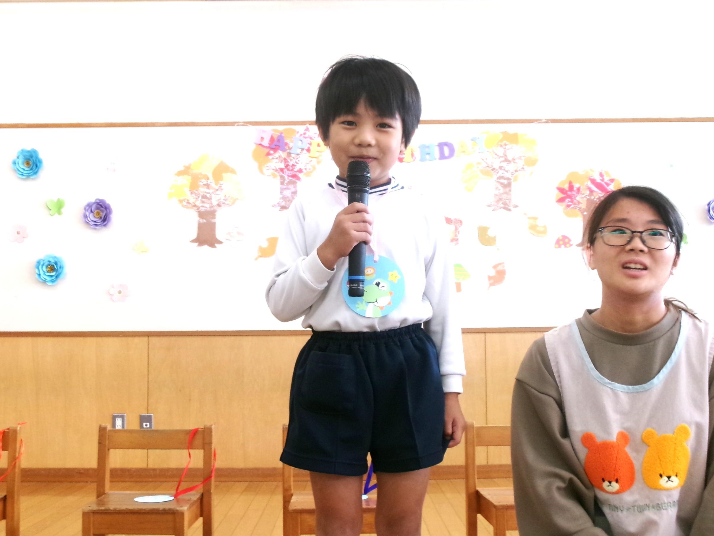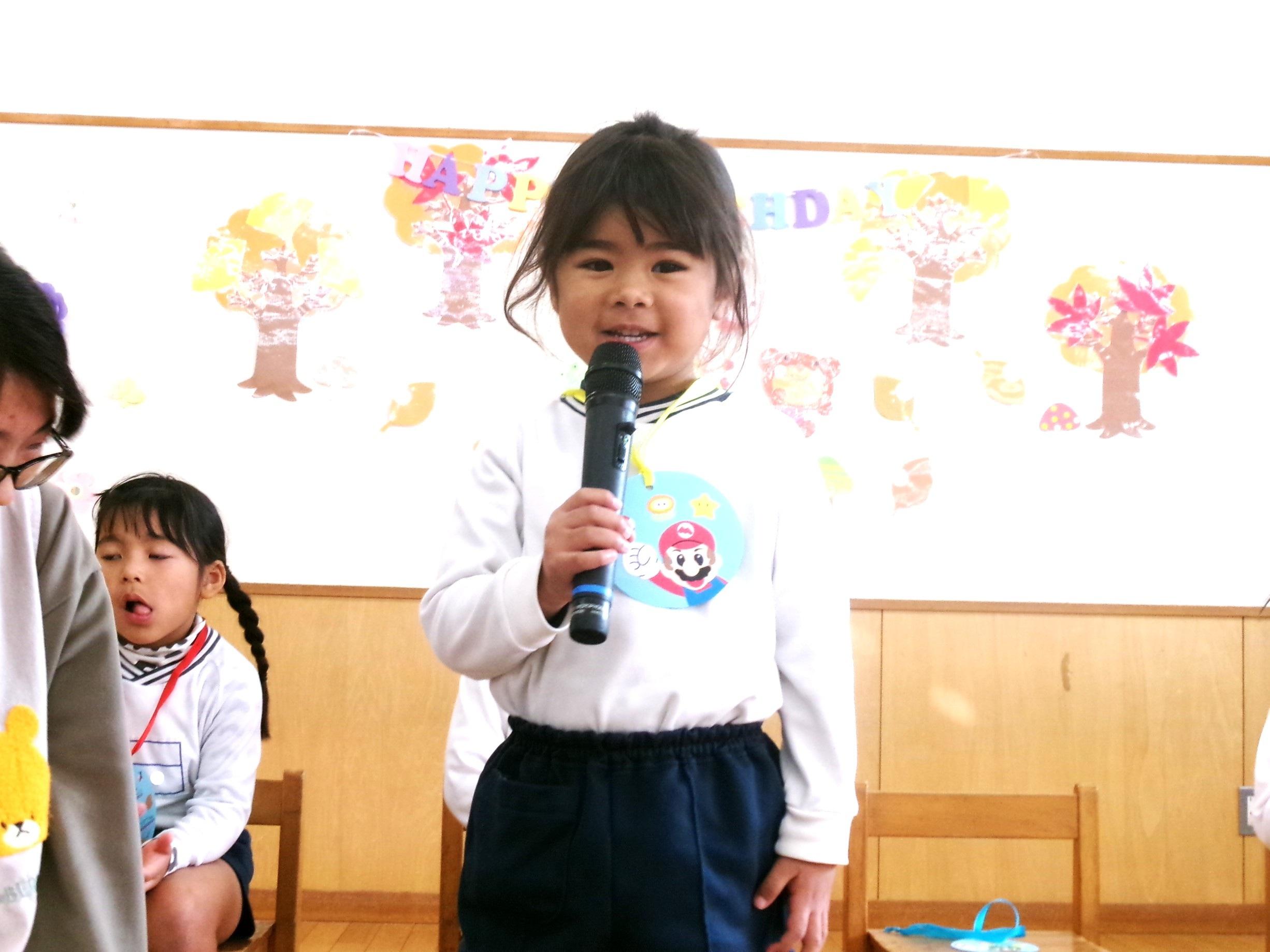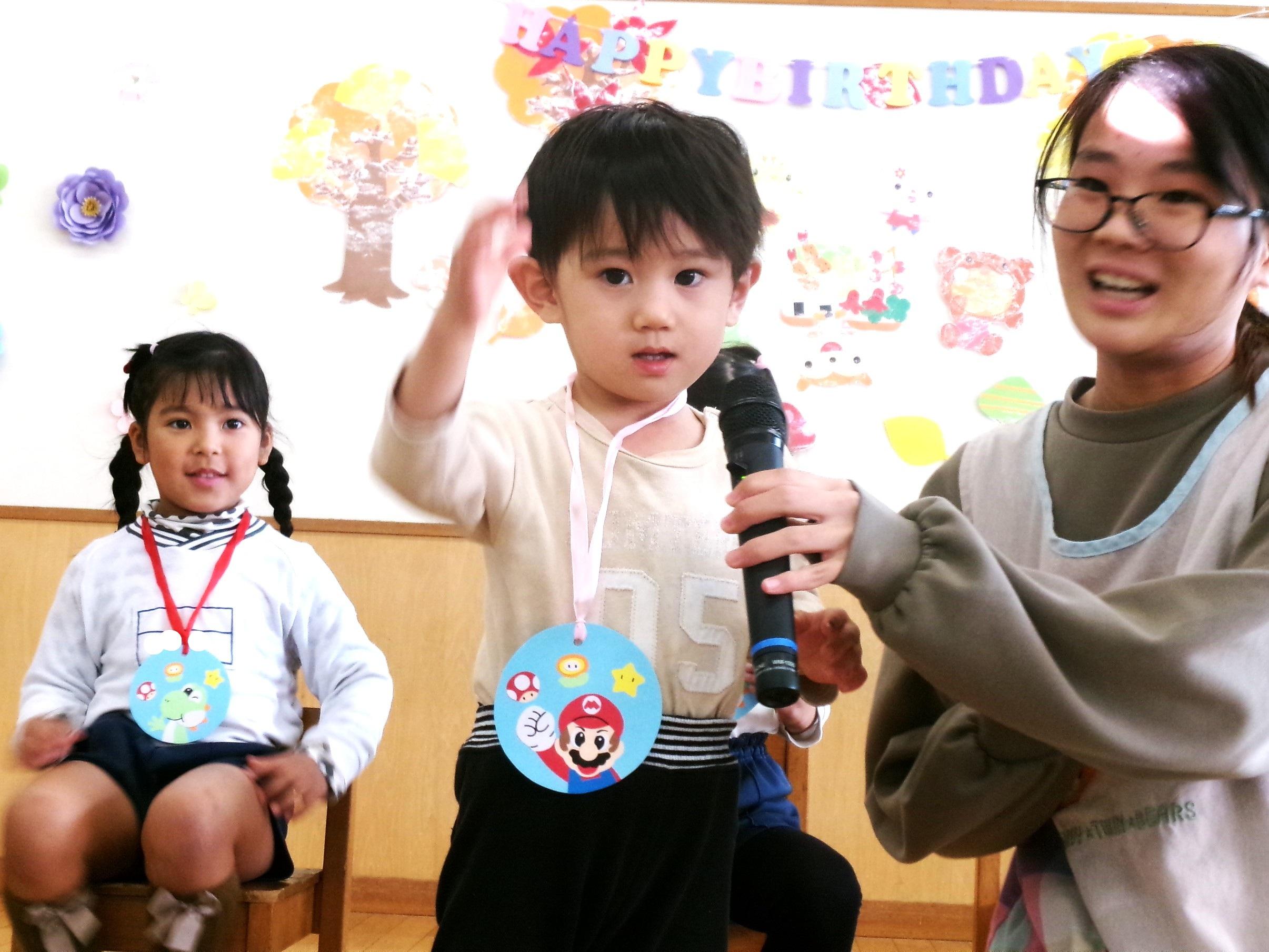 11月生まれのお友だちは9名でした。好きな食べ物や遠足で行った動物園での動物のお話を聞かせてくれました。各クラスからの歌のプレゼントもありました。11月生まれのお友だちお誕生日おめでとう✨