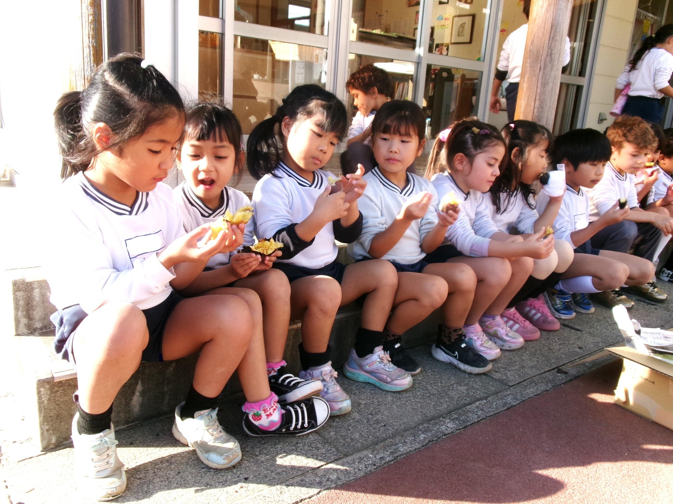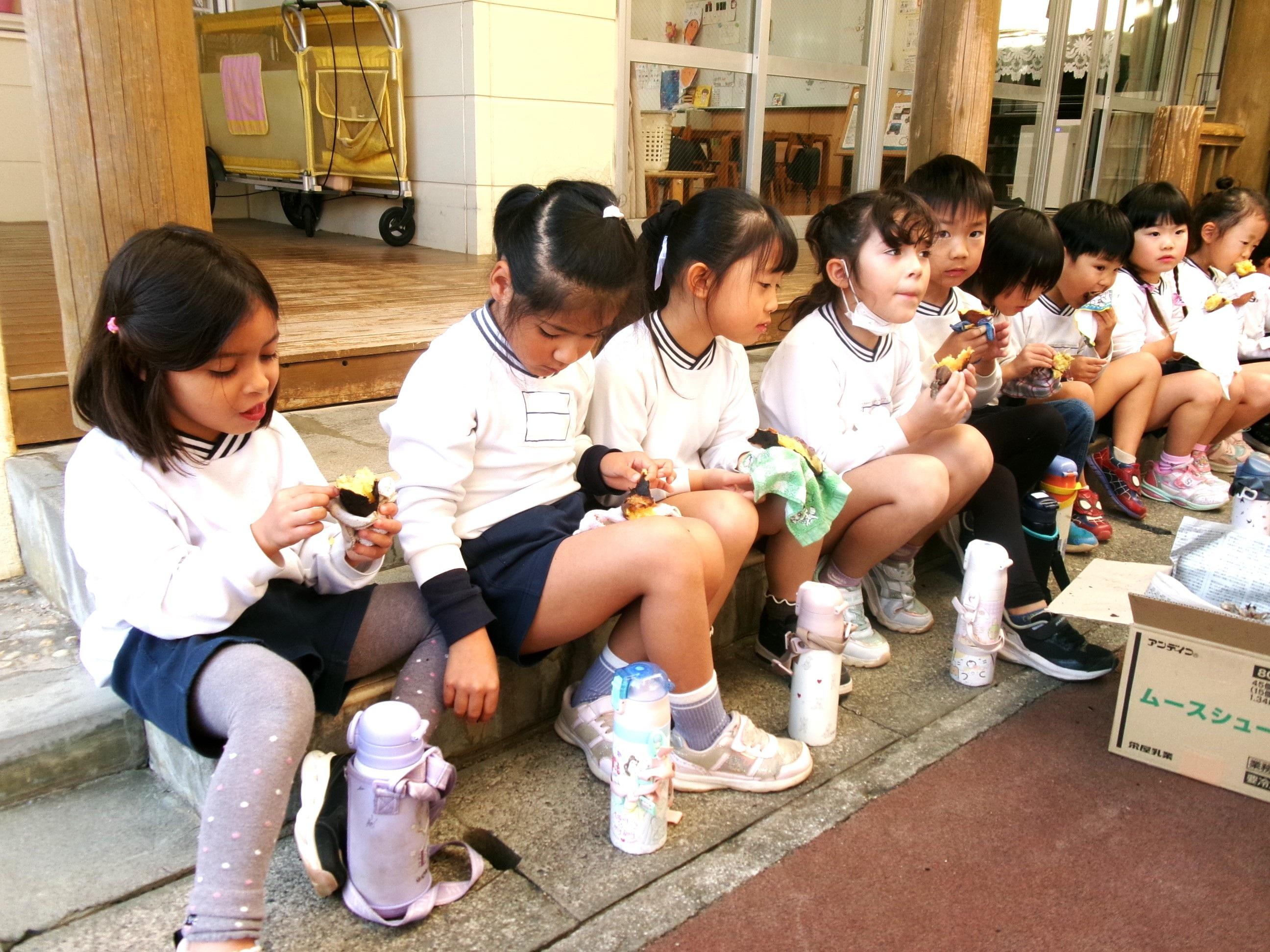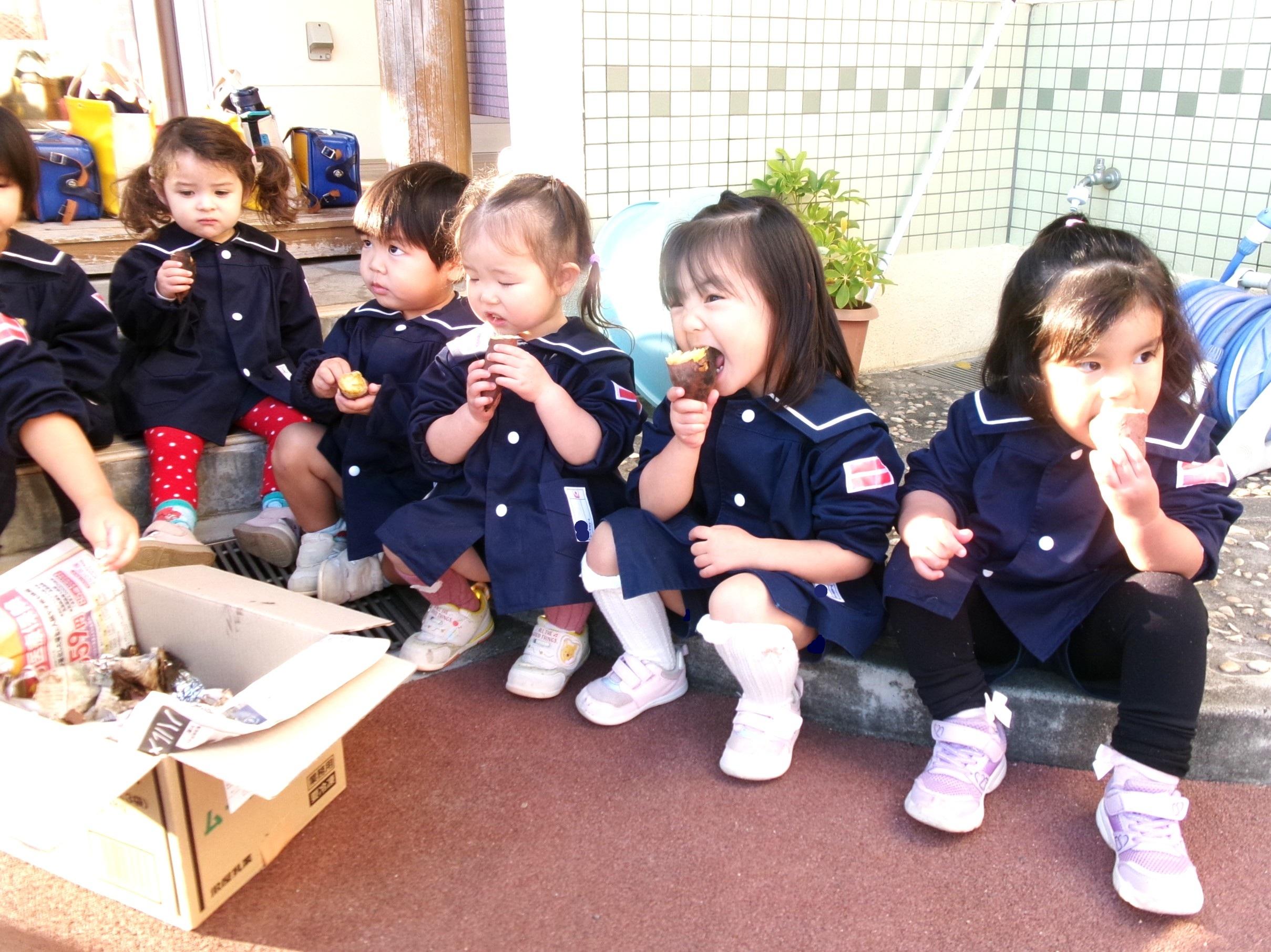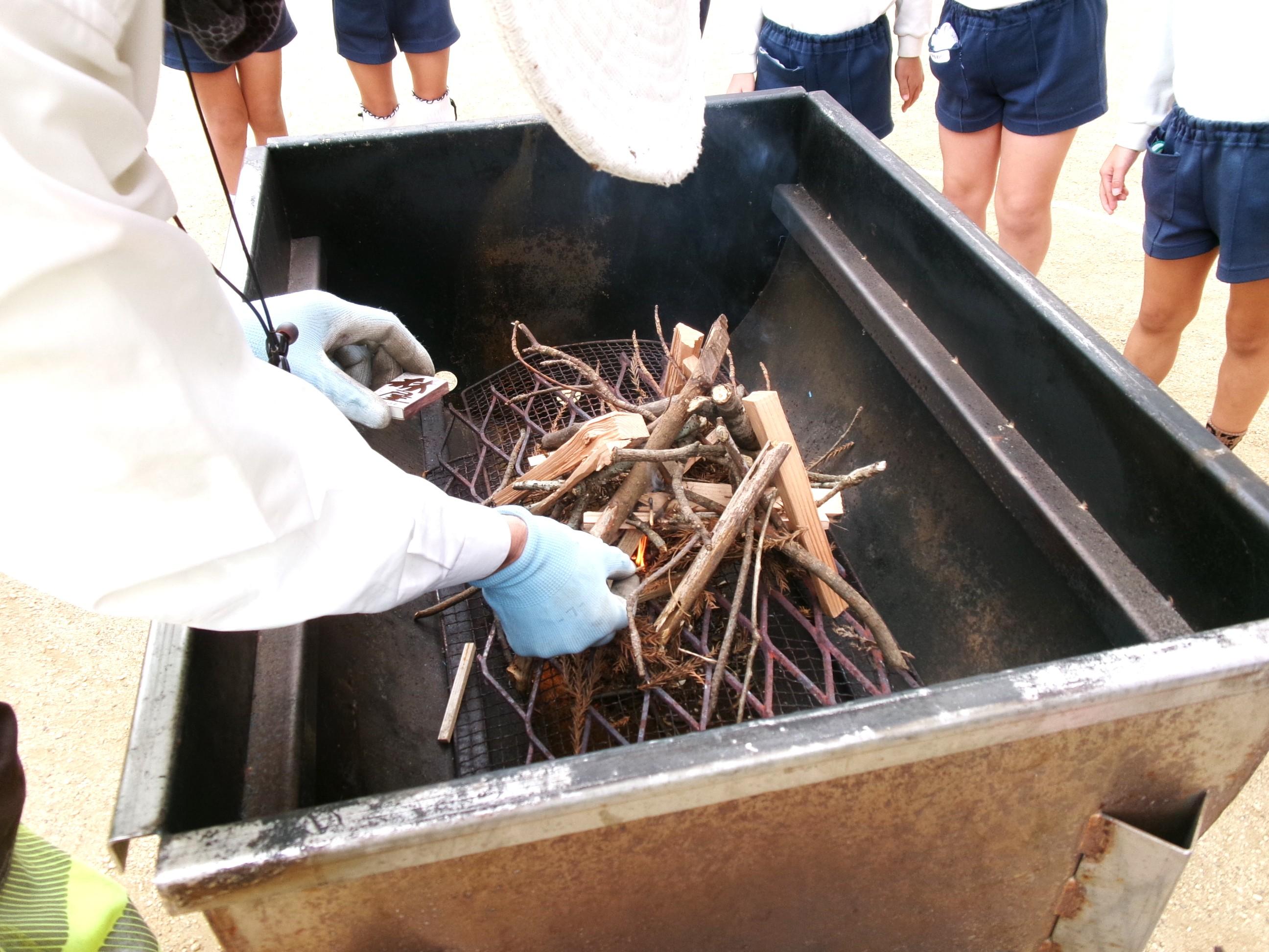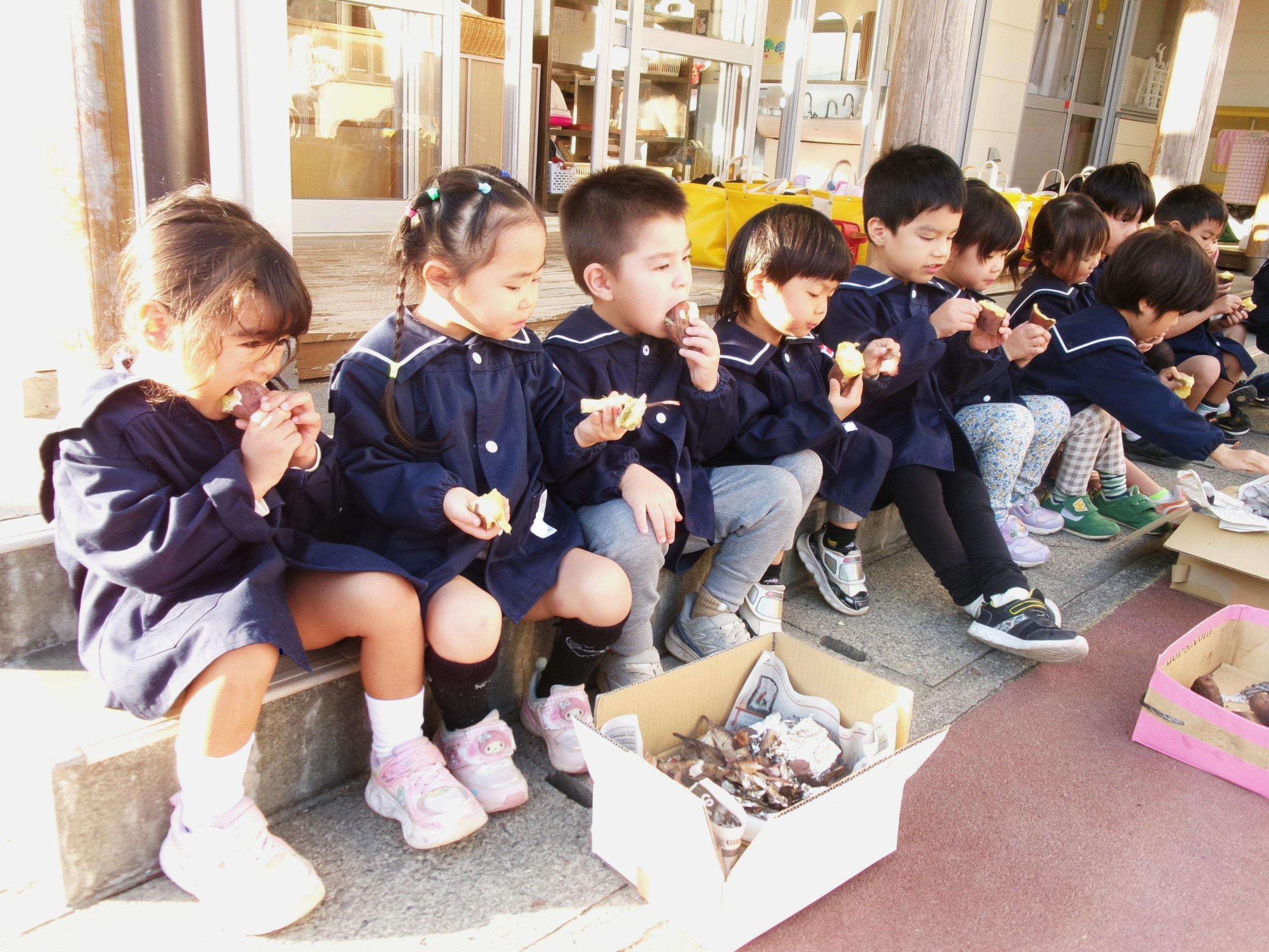 27日に焼き芋をしました。9月にみんなで掘ってきたさつま芋を洗って、新聞紙で巻いて、水で濡らして、アルミホイルでグルグル・・・午後には移動環境教室でお世話になっている隊長さんが来てくださり、ひまわり組さんに火おこしを見せてくださいました。まずは、火が付きやすい枯れたスギの葉っぱを敷き、その上に細い枝を置き、少しずつ太い木を乗せていきました。本当に火がつくのかなぁ~?と見ていると、マッチの火がスギの葉っぱに移り、モクモクと煙が出て段々と大きな火になっていき、スゴイ!と子どもたちの声が聞こえました。みんなで準備したお芋をコンロとドラム缶に並べ、あっという間にホクホクの焼き芋が出来ました🍠みんなでおかわりもたくさんして美味しくいただきました。