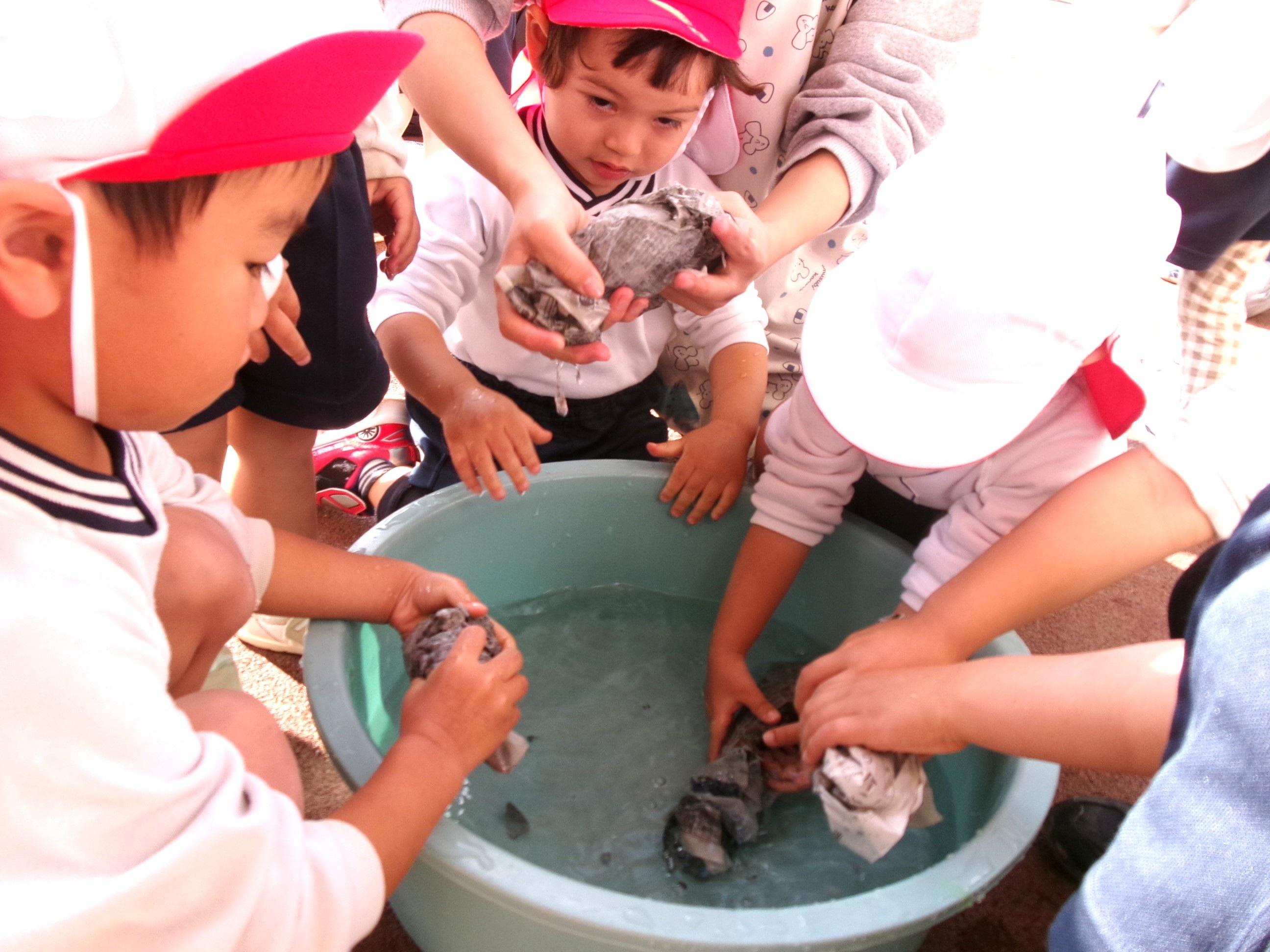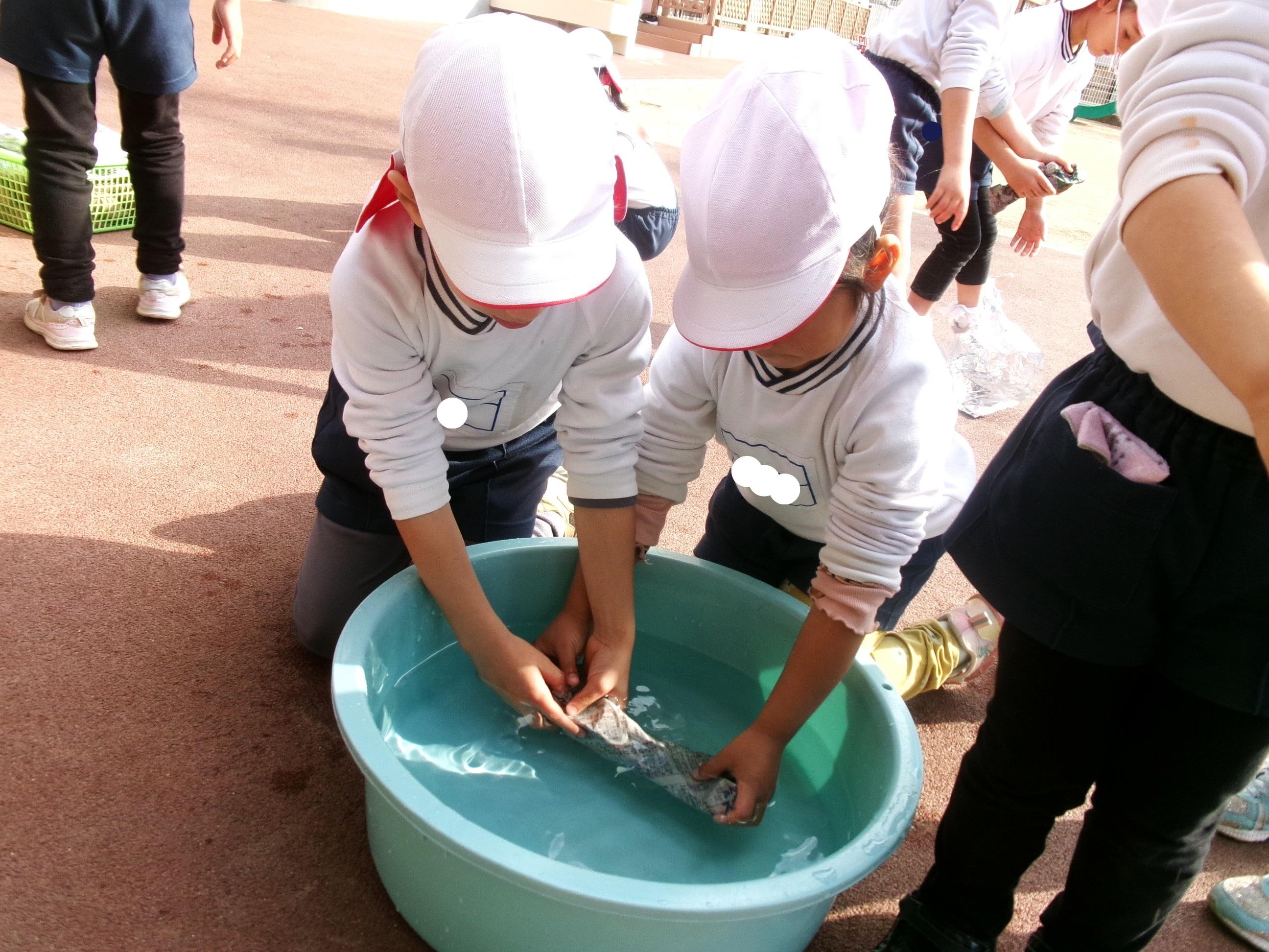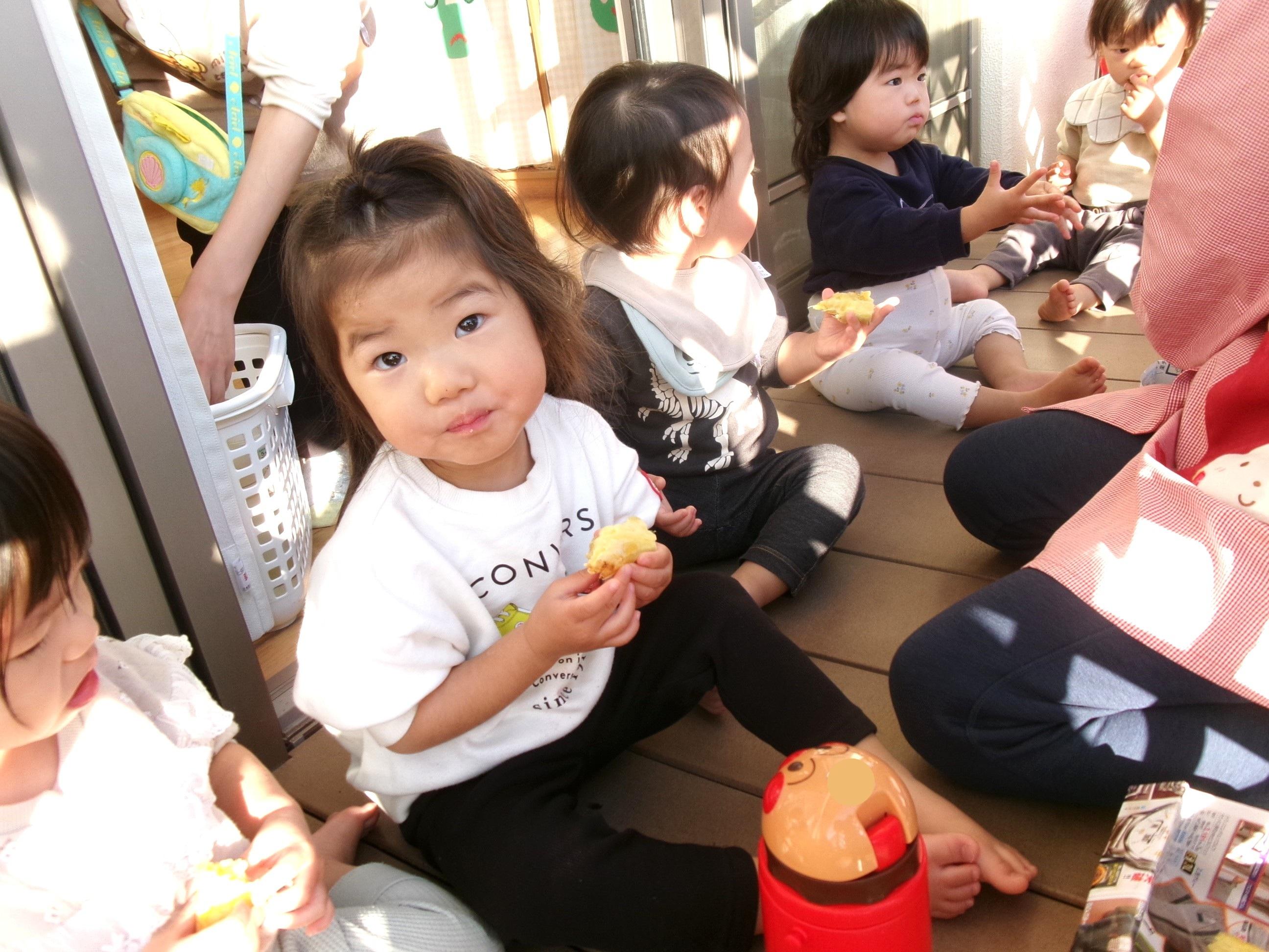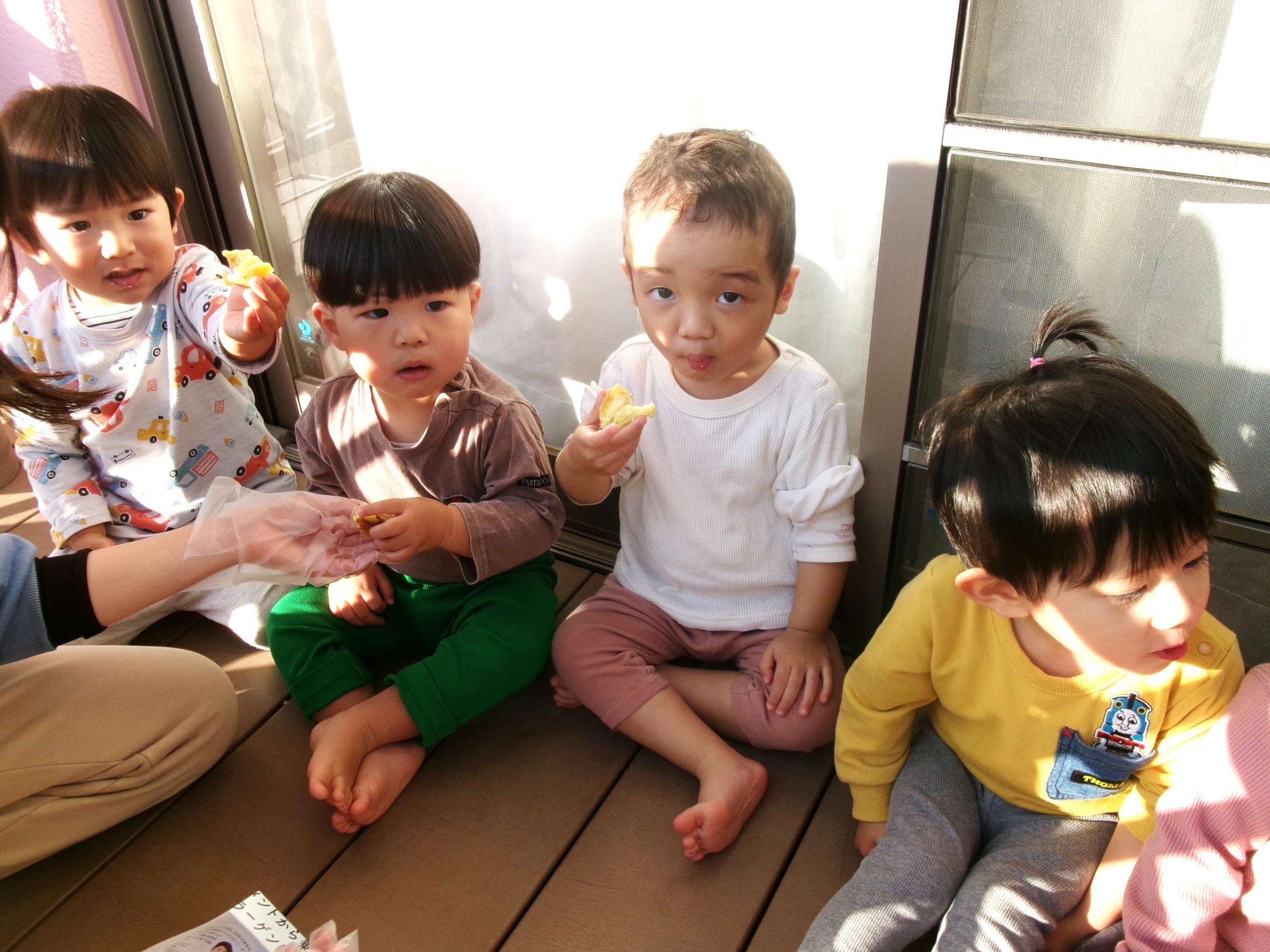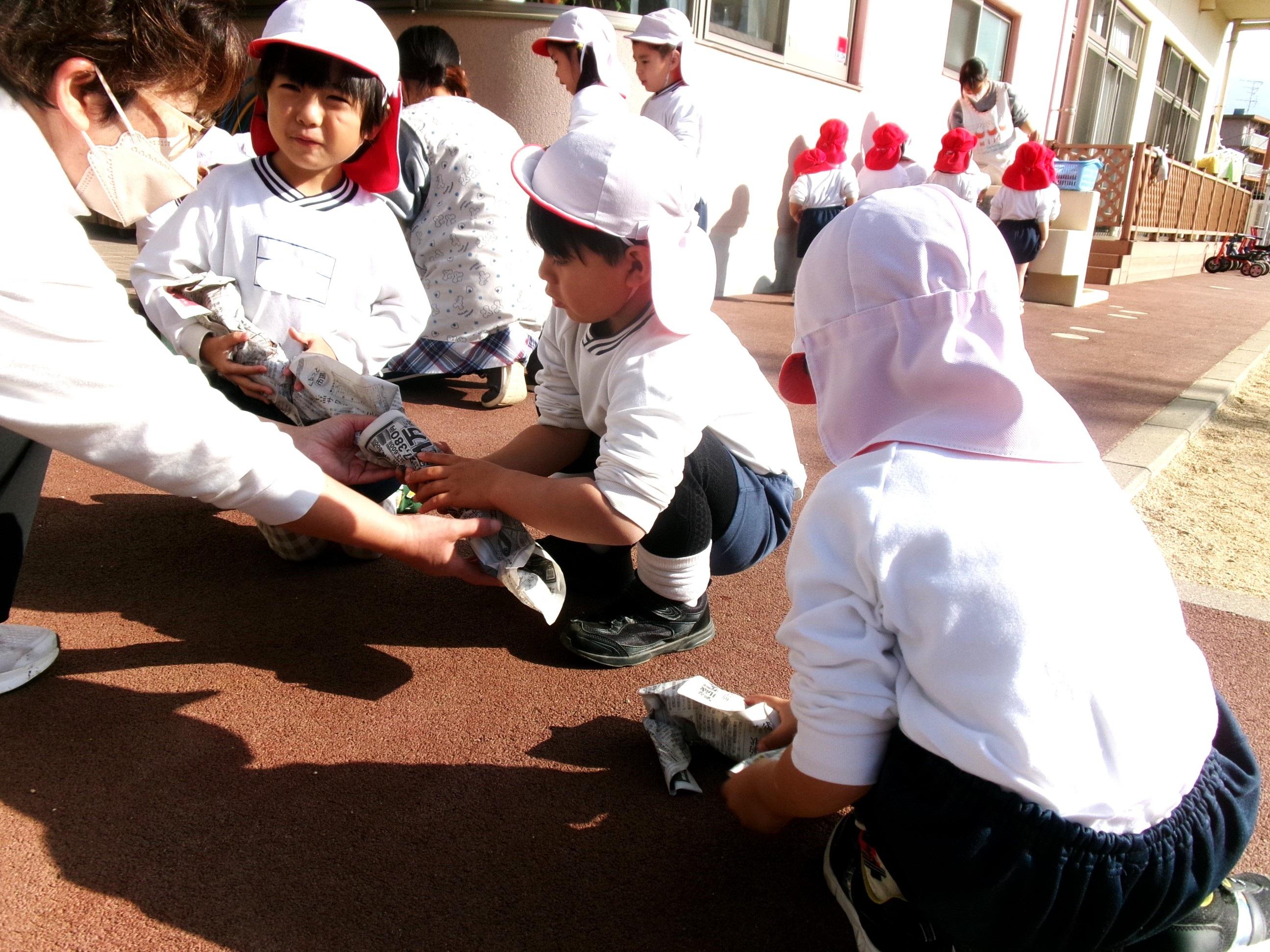 27日に焼き芋をしました。9月にみんなで掘ってきたさつま芋を洗って、新聞紙で巻いて、水で濡らして、アルミホイルでグルグル・・・午後には移動環境教室でお世話になっている隊長さんが来てくださり、ひまわり組さんに火おこしを見せてくださいました。まずは、火が付きやすい枯れたスギの葉っぱを敷き、その上に細い枝を置き、少しずつ太い木を乗せていきました。本当に火がつくのかなぁ~?と見ていると、マッチの火がスギの葉っぱに移り、モクモクと煙が出て段々と大きな火になっていき、スゴイ!と子どもたちの声が聞こえました。みんなで準備したお芋をコンロとドラム缶に並べ、あっという間にホクホクの焼き芋が出来ました🍠みんなでおかわりもたくさんして美味しくいただきました。