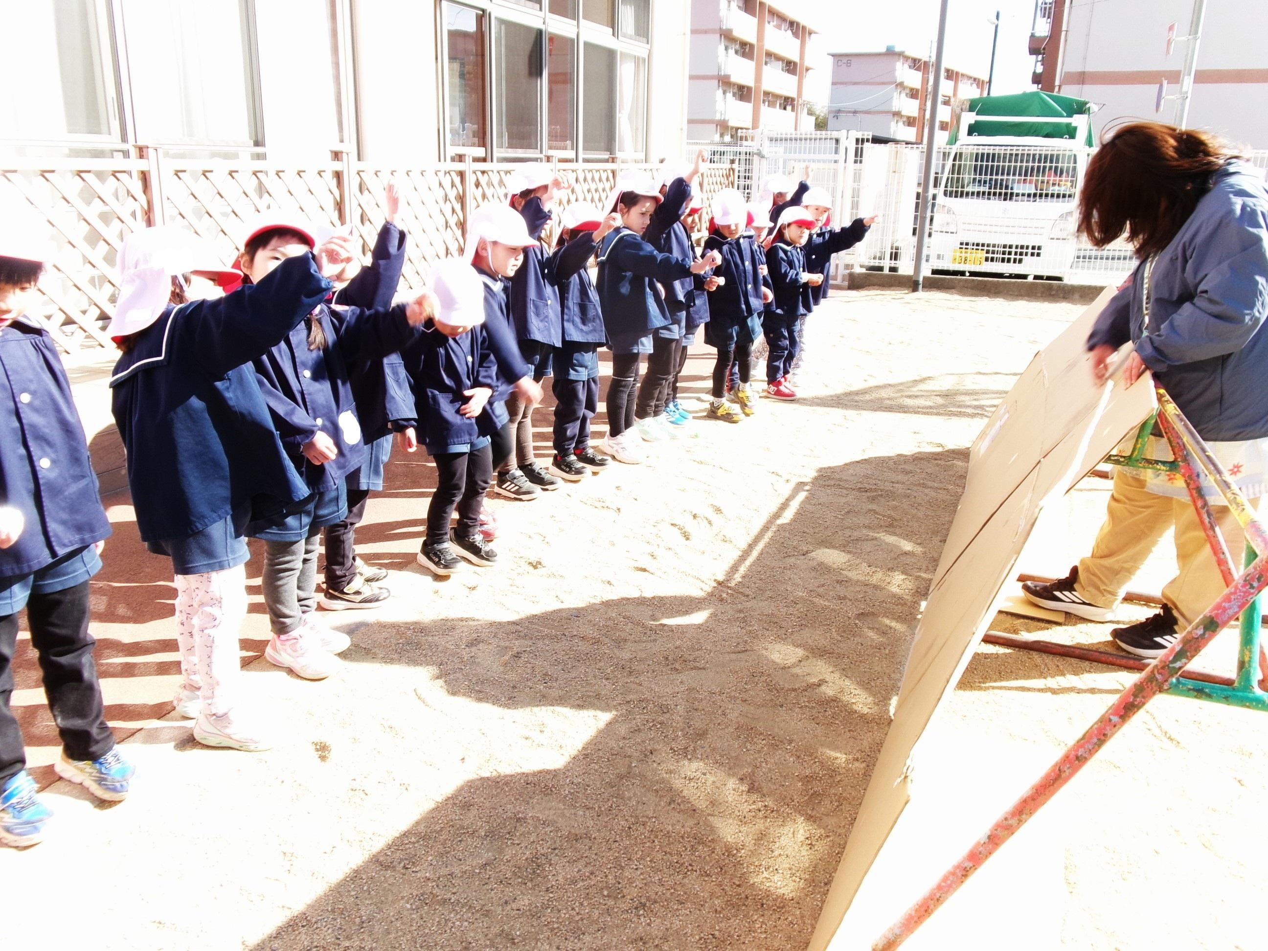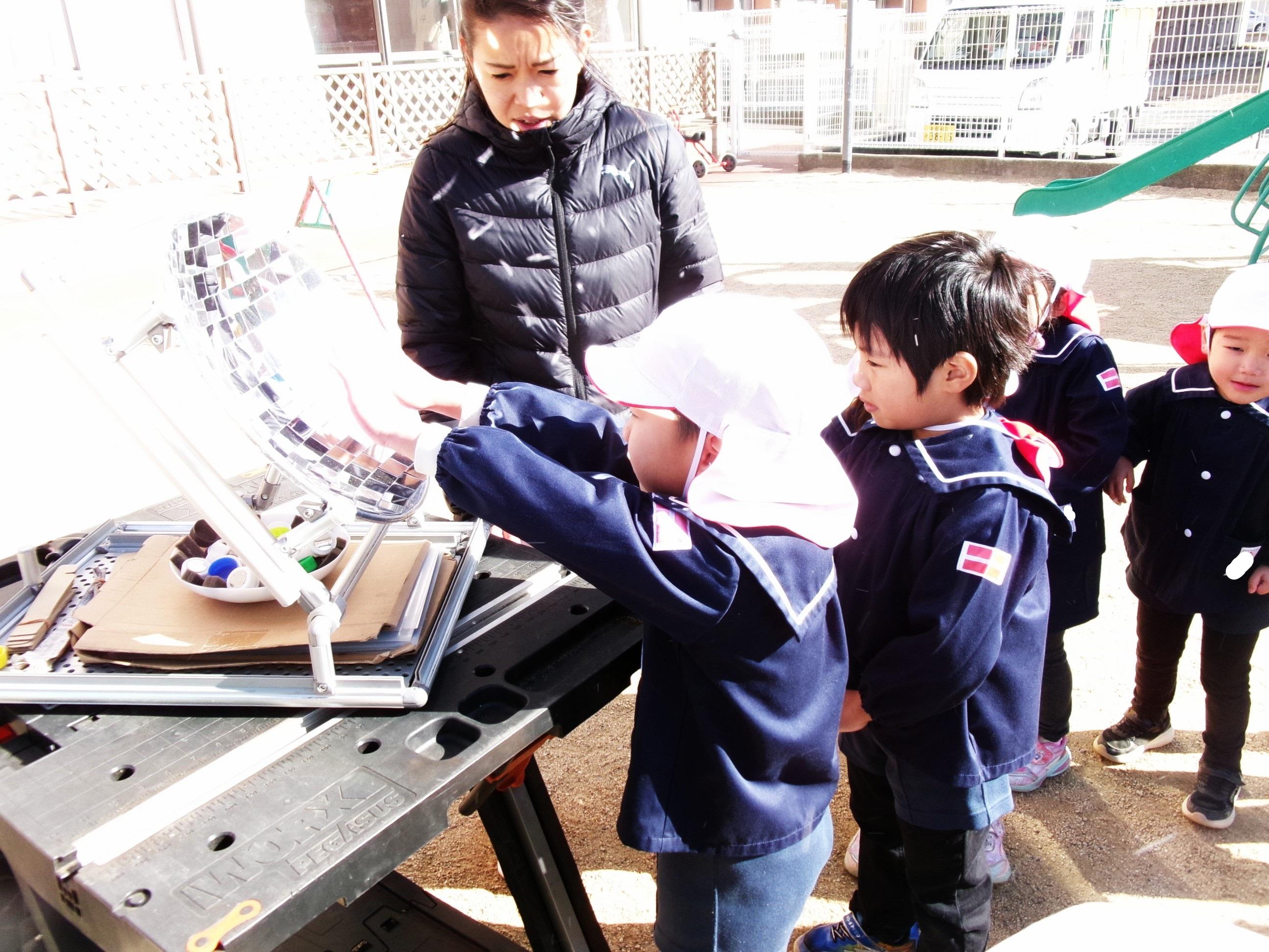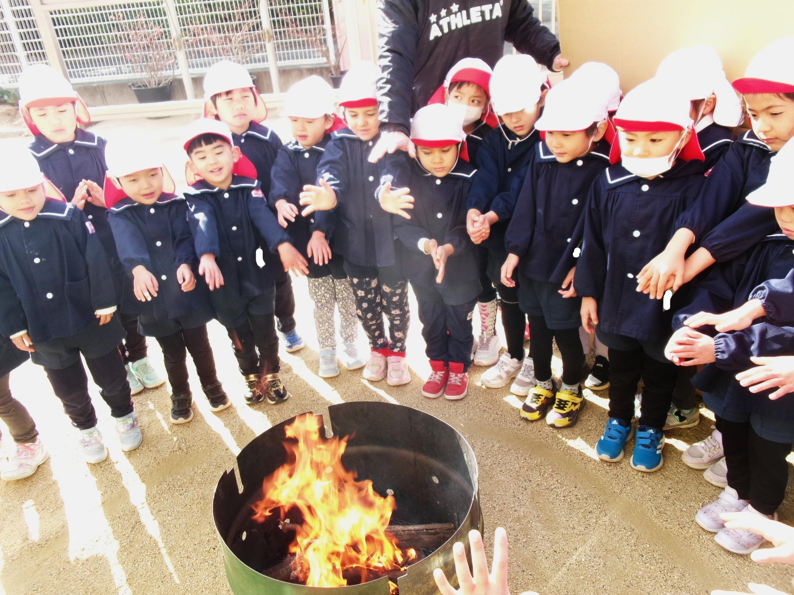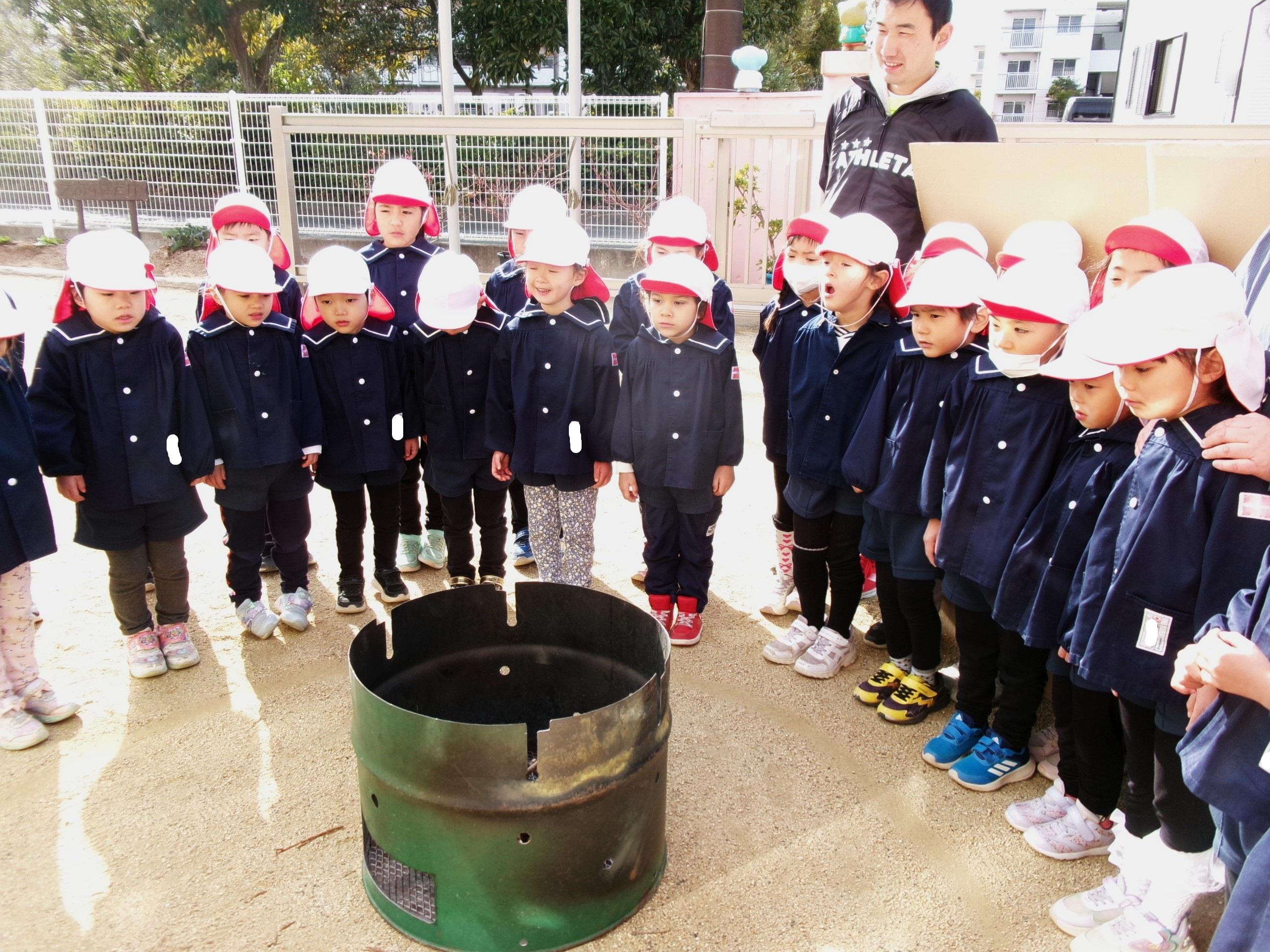 隊長さんに来ていただき、環境教室を行いました。今日は、ゆり組さんが火のつけ方を教わったり、火の暖かさを感じたり、地面に寝転んで太陽の暖かさを感じる体験をしました。子どもたちは、火がつくまでの様子を興味深げに見て、火がつくと「あったか~い!」と火の暖かさを感じていました。👏そして、隊長さん手作りの光を集める鏡に手を近づけると・・・「あっ!あったかい!」と太陽の光の温かさも感じていました。その後は、お待ちかねのピザ窯で焼いたピザを美味しくいただきました。隊長さんありがとうございました!
