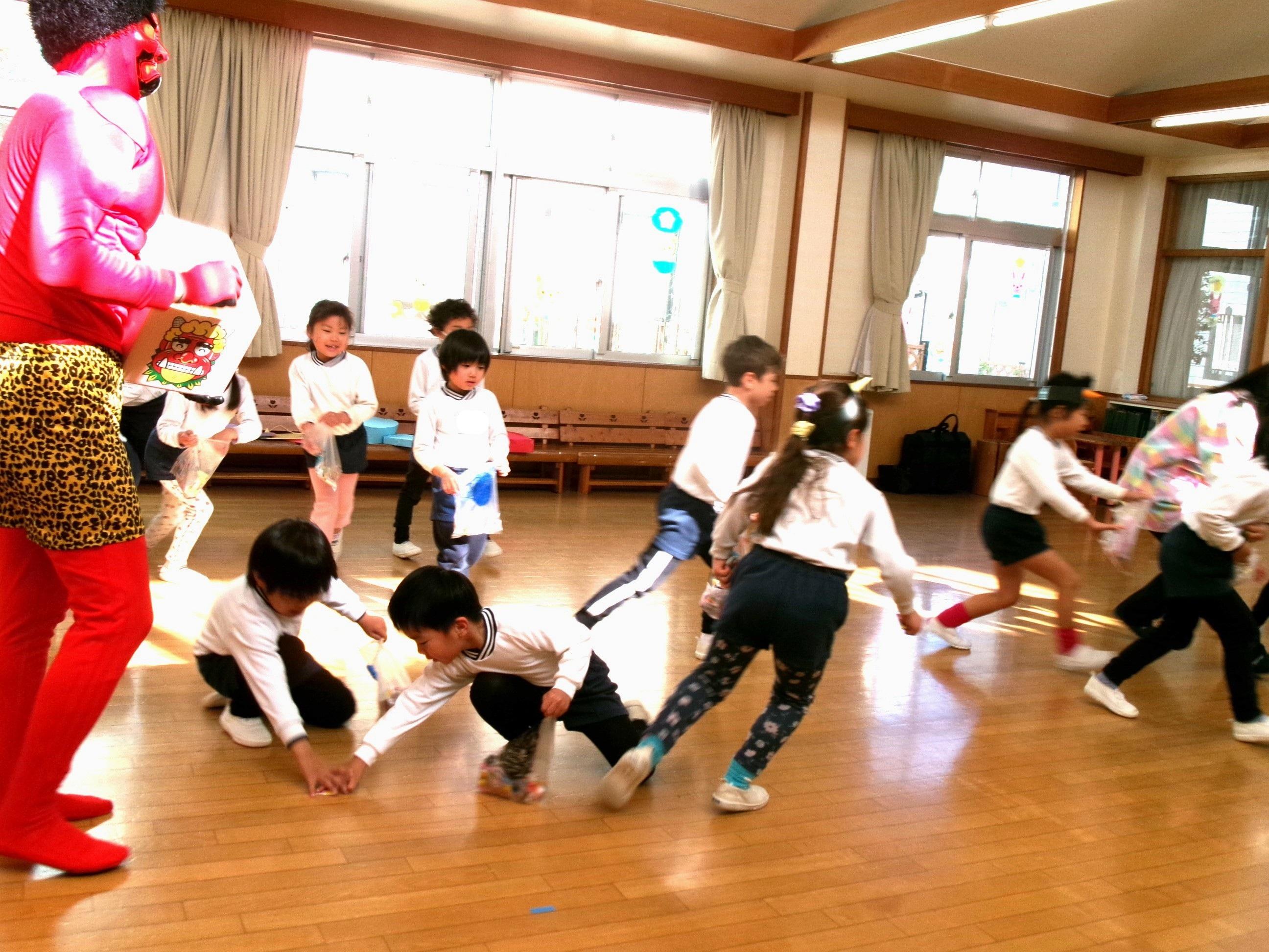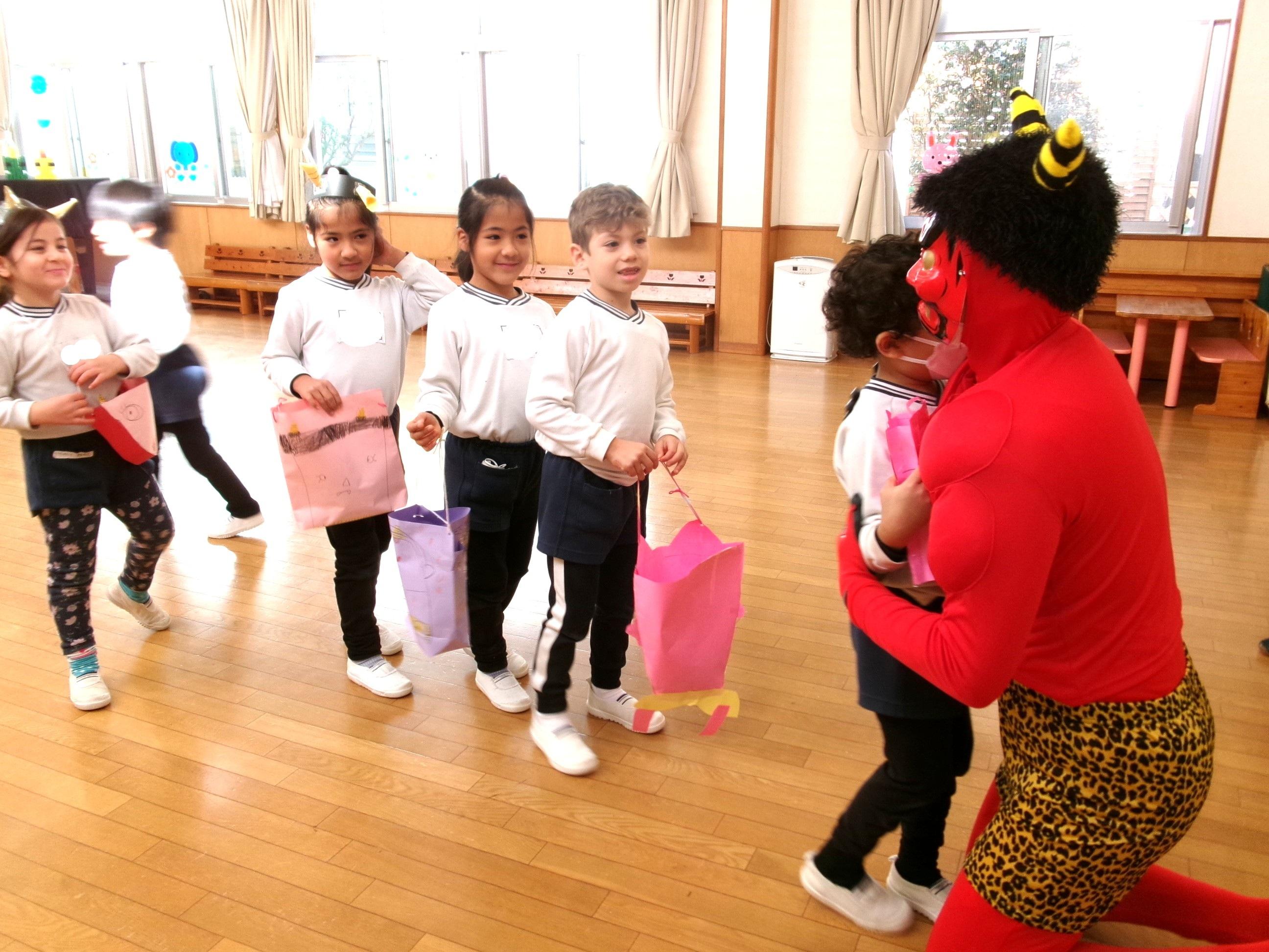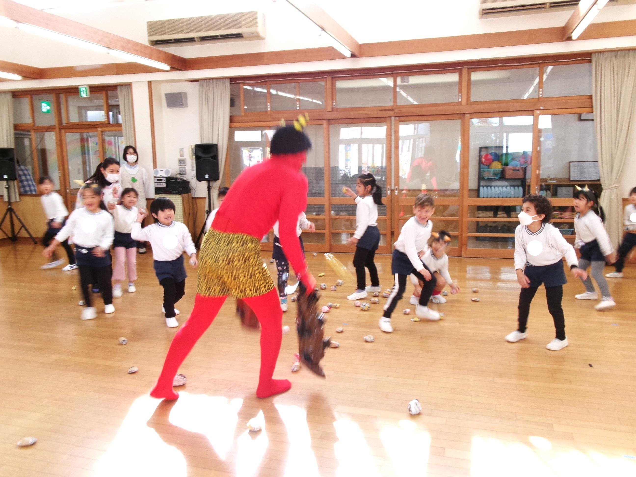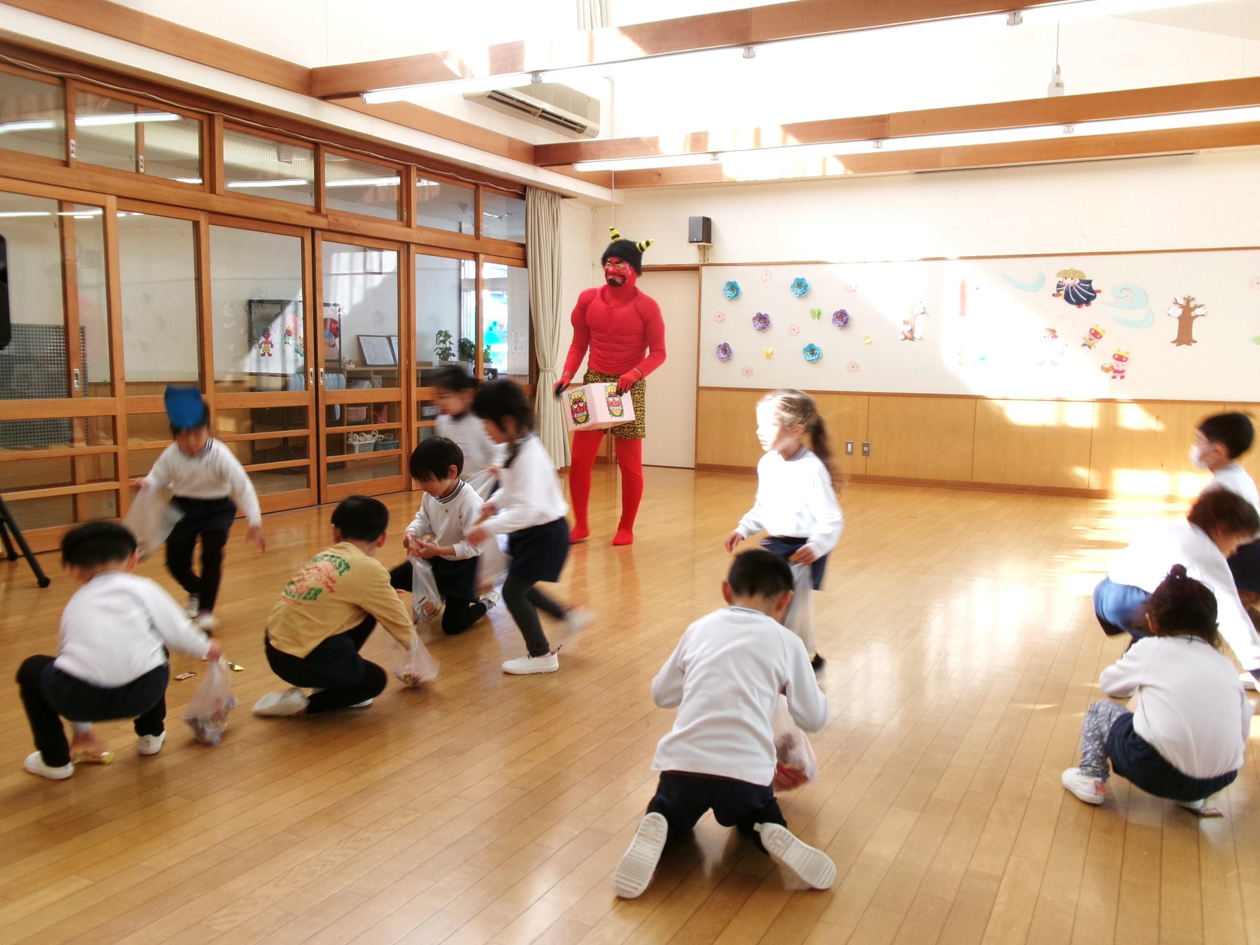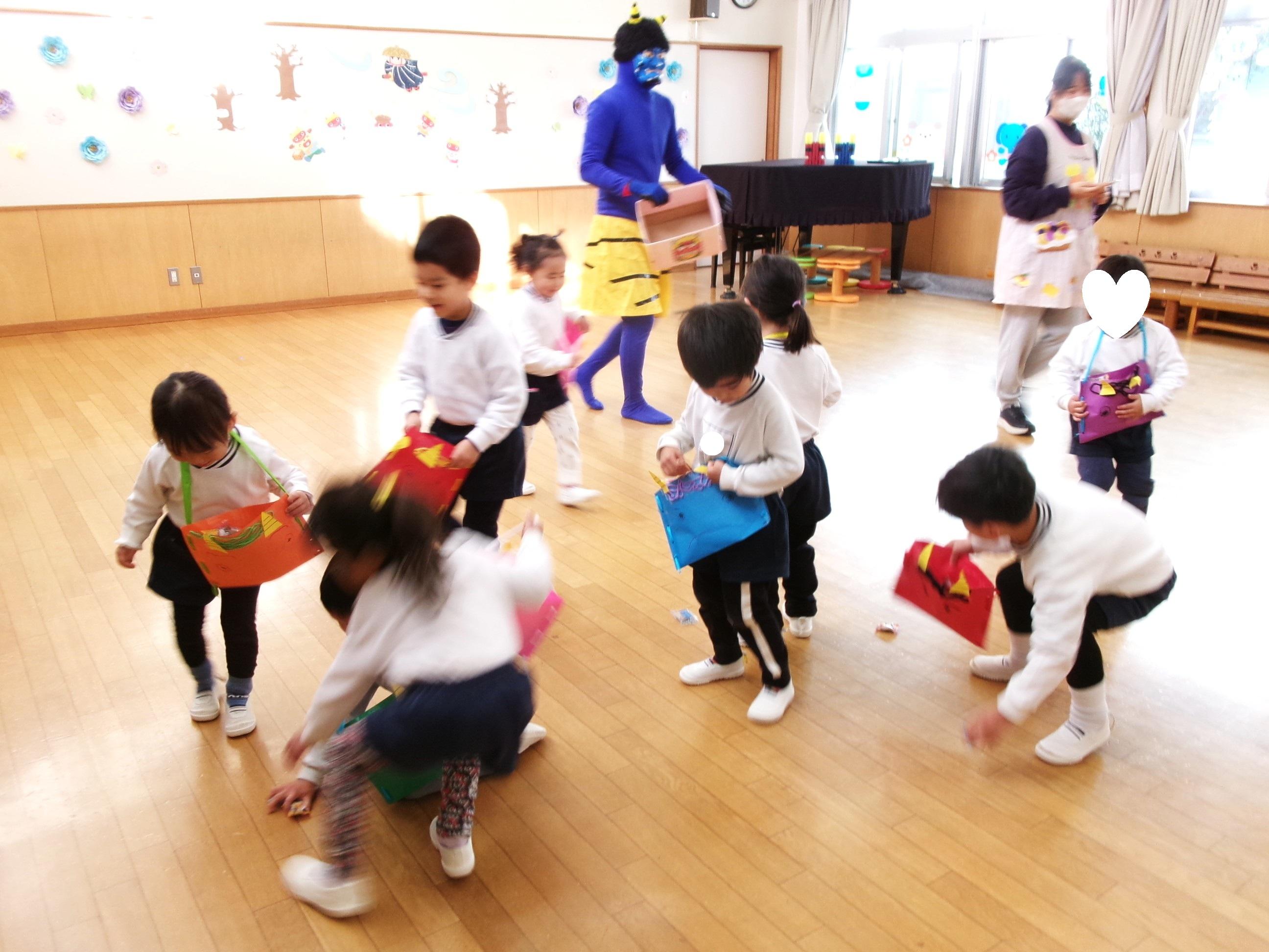 今日は節分。園で節分会を行い、節分や柊鰯の話を聞きました。そして、園に来てくれたやさしい鬼さんにお菓子を撒いてもらい、たくさん拾って自分たちで作った鬼バックに一生懸命入れていましたよ。ゆり組(4歳児)、ひまわり組(5歳児)は、鬼との対決の後、お菓子拾いを楽しみました!そして、最後に鬼さんとギュッとハグしてもらい更に仲良くなりました😊鬼さんまた遊びに来てくれるかな~?